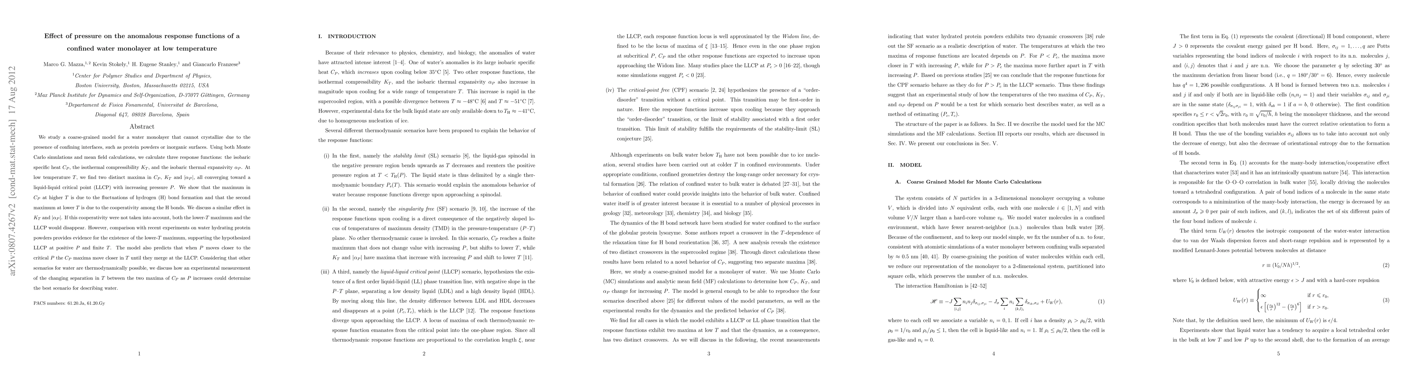 We study a coarse-grained model for a water monolayer that cannot crystallize due to the presence of confining interfaces, such as protein powders or inorganic surfaces. Using both Monte Carlo simulations and mean field calculations, we calculate three response functions: the isobaric specific heat $C_P$, the isothermal compressibility $K_T$, and the isobaric thermal expansivity $\alpha_P$. At low temperature $T$, we find two distinct maxima in $C_P$, $K_T$ and $|\alpha_P|$, all converging toward a liquid-liquid critical point (LLCP) with increasing pressure $P$. We show that the maximum in $C_P$ at higher $T$ is due to the fluctuations of hydrogen (H) bond formation and that the second maximum at lower $T$ is due to the cooperativity among the H bonds. We discuss a similar effect in $K_T$ and $|\alpha_P|$. If this cooperativity were not taken into account, both the lower-$T$ maximum and the LLCP would disappear. However, comparison with recent experiments on water hydrating protein powders provides evidence for the existence of the lower-$T$ maximum, supporting the hypothesized LLCP at positive $P$ and finite $T$. The model also predicts that when $P$ moves closer to the critical $P$ the $C_P$ maxima move closer in $T$ until they merge at the LLCP. Considering that other scenarios for water are thermodynamically possible, we discuss how an experimental measurement of the changing separation in $T$ between the two maxima of $C_P$ as $P$ increases could determine the best scenario for describing water.