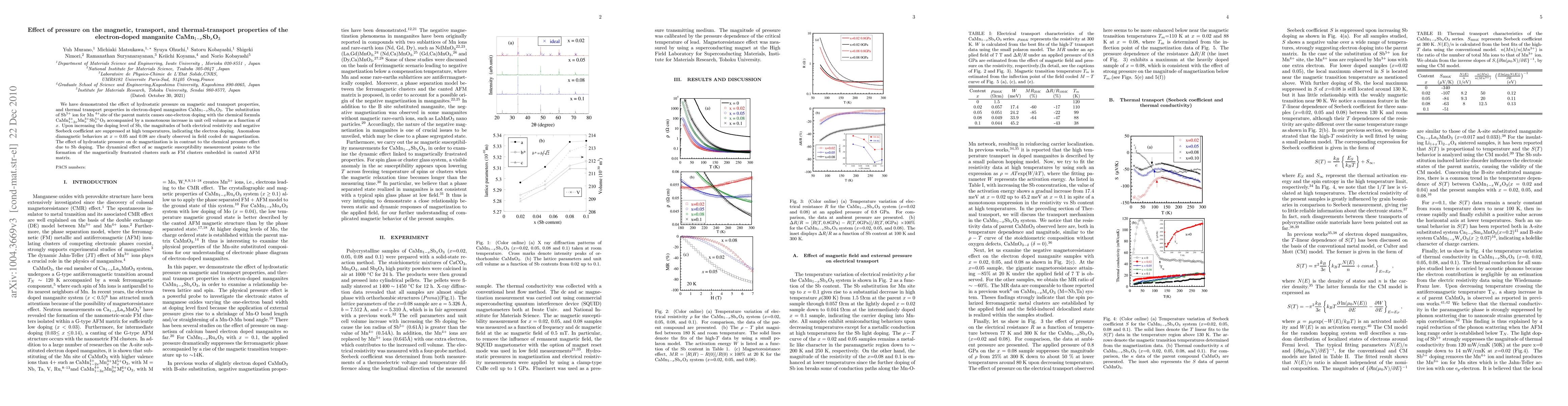 We have demonstrated the effect of hydrostatic pressure on magnetic and transport properties, and thermal transport properties in electron-doped manganites CaMn$_{1-x}$Sb$_{x}$O$_{3}$. The substitution of Sb$^{5+}$ ion for Mn $^{4+}$site of the parent matrix causes one-electron doping with the chemical formula CaMn$^{4+}_{1-2x}$Mn$^{3+}_{x}$Sb$^{5+}_{x}$O$_{3}$ accompanied by a monotonous increase in unit cell volume as a function of $x$. Upon increasing the doping level of Sb, the magnitudes of both electrical resistivity and negative Seebeck coefficient are suppressed at high temperatures, indicating the electron doping. Anomalous diamagnetic behaviors at $x=0.05$ and 0.08 are clearly observed in field cooled dc magnetization. The effect of hydrostatic pressure on dc magnetization is in contrast to the chemical pressure effect due to Sb doping. The dynamical effect of ac magnetic susceptibility measurement points to the formation of the magnetically frustrated clusters such as FM clusters embedded in canted AFM matrix.