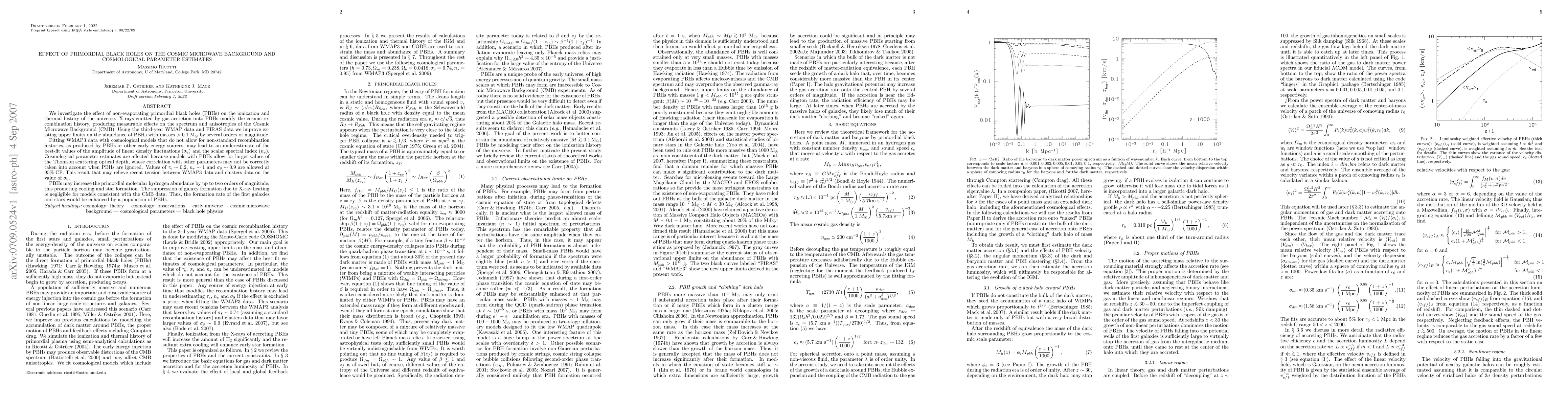 We investigate the effect of non-evaporating primordial black holes (PBHs) on the ionization and thermal history of the universe. X-rays emitted by gas accretion onto PBHs modify the cosmic recombination history, producing measurable effects on the spectrum and anisotropies of the Cosmic Microwave Background (CMB). Using the third-year WMAP data and FIRAS data we improve existing upper limits on the abundance of PBHs with masses >0.1 Msun by several orders of magnitude. Fitting WMAP3 data with cosmological models that do not allow for non-standard recombination histories, as produced by PBHs or other early energy sources, may lead to an underestimate of the best-fit values of the amplitude of linear density fluctuations (sigma_8) and the scalar spectral index (n_s). Cosmological parameter estimates are affected because models with PBHs allow for larger values of the Thomson scattering optical depth, whose correlation with other parameters may not be correctly taken into account when PBHs are ignored. Values of tau_e=0.2, n_s=1 and sigma_8=0.9 are allowed at 95% CF. This result that may relieve recent tension between WMAP3 data and clusters data on the value of sigma_8. PBHs may increase the primordial molecular hydrogen abundance by up to two orders of magnitude, this promoting cooling and star formation. The suppression of galaxy formation due to X-ray heating is negligible for models consistent with the CMB data. Thus, the formation rate of the first galaxies and stars would be enhanced by a population of PBHs.
