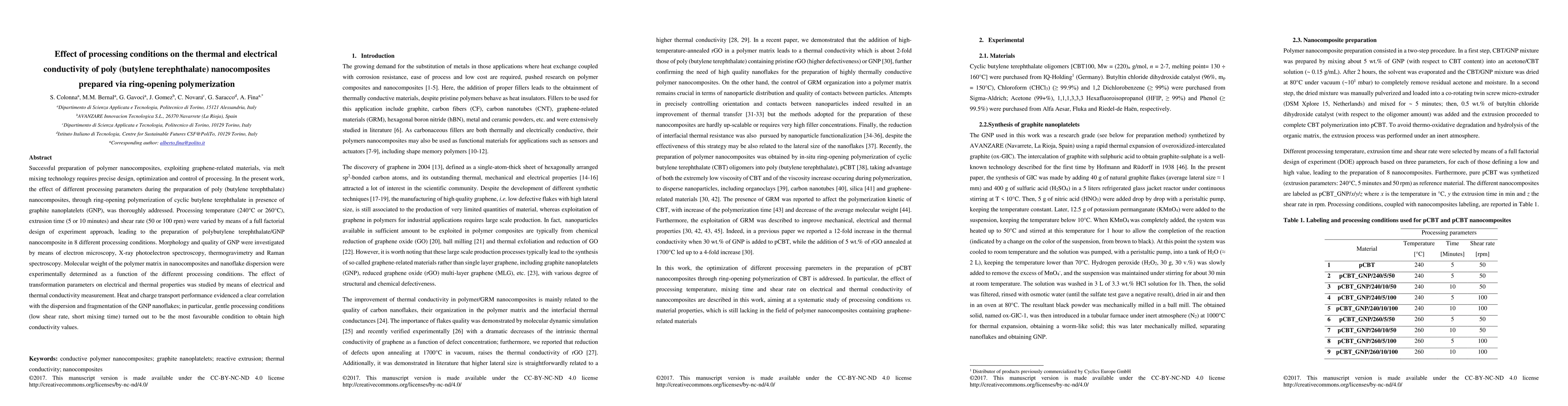 This study investigates the impact of processing conditions on the thermal and electrical conductivity of poly (butylene terephthalate) nanocomposites prepared via ring-opening polymerization with graphite nanoplatelets. Gentle processing conditions (low shear, short time) yielded the best dispersion and fragmentation of GNP, enhancing the nanocomposite's heat and charge transport performance.