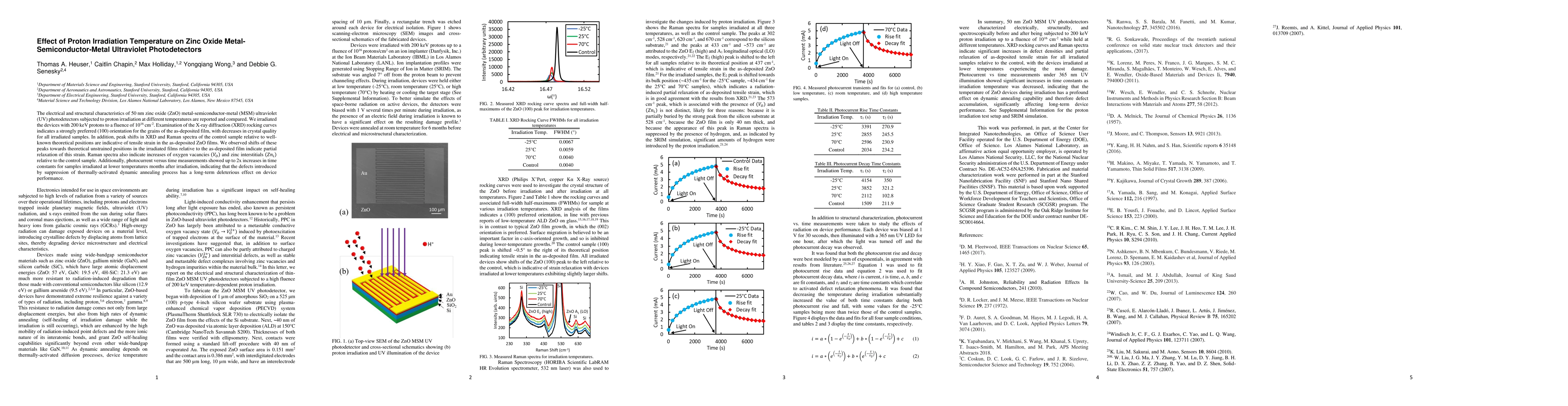 The electrical and structural characteristics of 50 nm zinc oxide (ZnO) metal-semiconductor-metal (MSM) ultraviolet (UV) photodetectors subjected to proton irradiation at different temperatures are reported and compared. We irradiated the devices with 200 keV protons to a fluence of 1016 cm-2. Examination of the X-ray diffraction (XRD) rocking curves indicates a strongly preferred (100) orientation for the grains of the as-deposited film, with decreases in crystal quality for all irradiated samples. In addition, peak shifts in XRD and Raman spectra of the control sample relative to well-known theoretical positions are indicative of tensile strain in the as-deposited ZnO films. We observed shifts of these peaks towards theoretical unstrained positions in the irradiated films relative to the as-deposited film indicate partial relaxation of this strain. Raman spectra also indicate increases of oxygen vacancies (V_O ) and zinc interstitials (Zn_i ) relative to the control sample. Additionally, photocurrent versus time measurements showed up to 2x increases in time constants for samples irradiated at lower temperatures months after irradiation, indicating that the defects introduced by suppression of thermally-activated dynamic annealing process has a long-term deleterious effect on device performance.