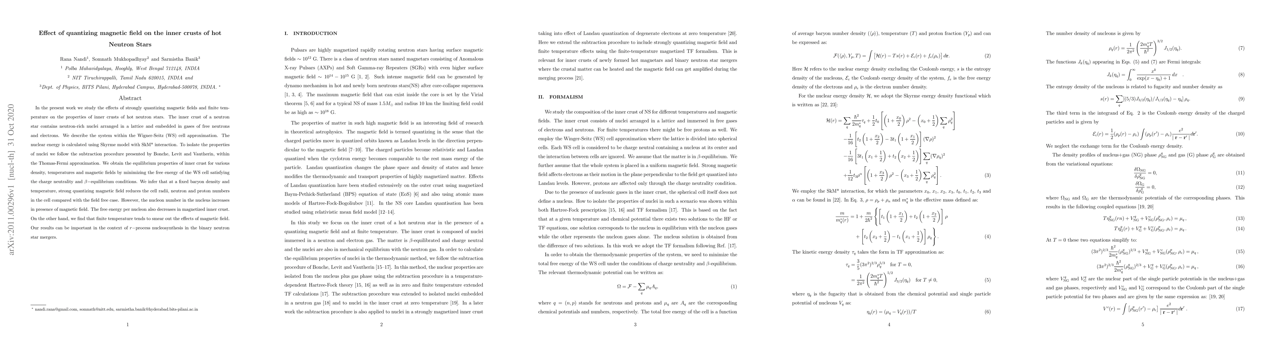 This study investigates the impact of strongly quantizing magnetic fields and finite temperatures on the inner crusts of hot neutron stars, revealing that strong magnetic fields reduce cell radii and nucleon numbers in the cell while increasing nucleon numbers in nuclei, and that finite temperatures diminish the magnetic field's effects. These findings are crucial for understanding $r-$process nucleosynthesis in neutron star mergers.