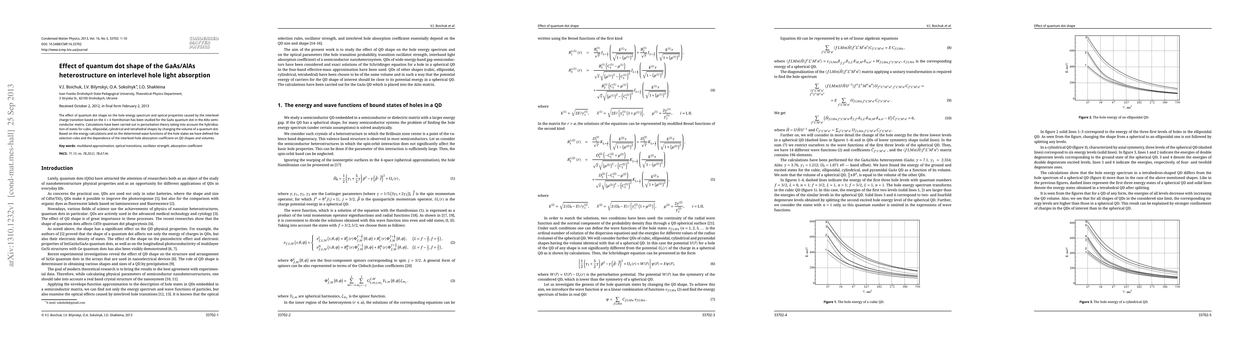 The effect of quantum dot shape on the hole energy spectrum and optical properties caused by the interlevel charge transition based on the 4x4 Hamiltonian has been studied for the GaAs quantum dot in the AlAs semiconductor matrix. Calculations have been carried out in perturbation theory taking into account the hybridization of states for cubic, ellipsoidal, cylindrical and tetrahedral shapes by changing the volume of a quantum dot. Based on the energy calculations and on the determined wave functions of the hole states we have defined the selection rules and the dependence of the interlevel hole absorption coefficient on QD shapes and volumes.