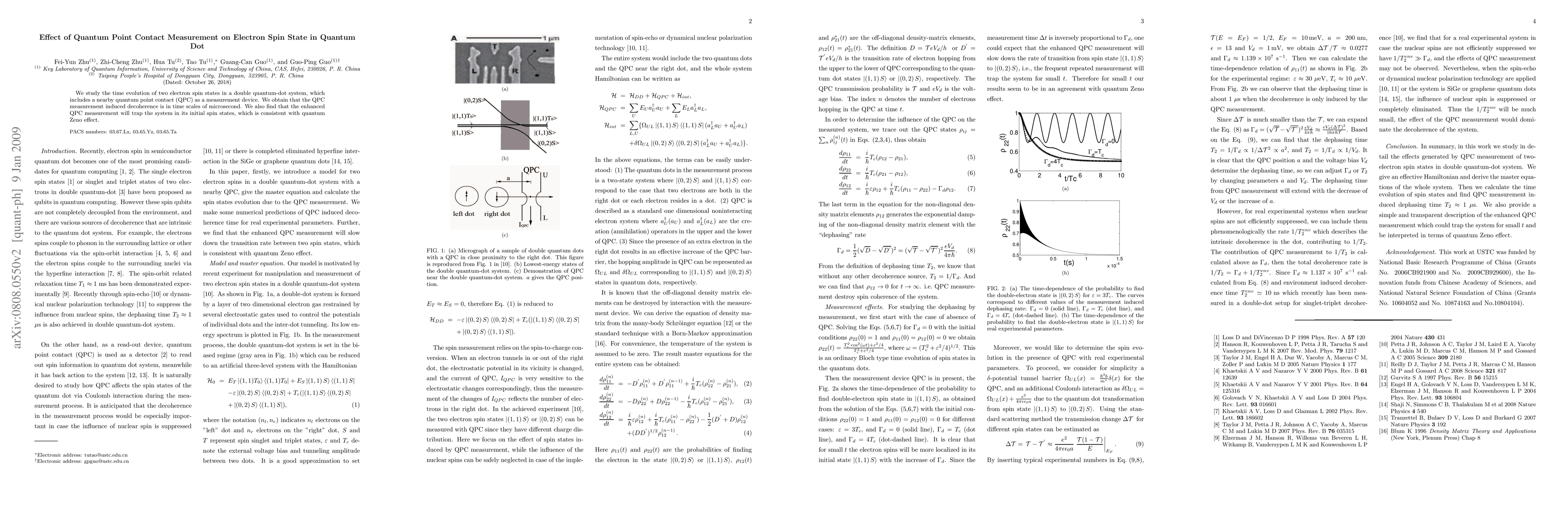We study the time evolution of two electron spin states in a double quantum-dot system, which includes a nearby quantum point contact (QPC) as a measurement device. We obtain that the QPC measurement induced decoherence is in time scales of microsecond. We also find that the enhanced QPC measurement will trap the system in its initial spin states, which is consistent with quantum Zeno effect.
