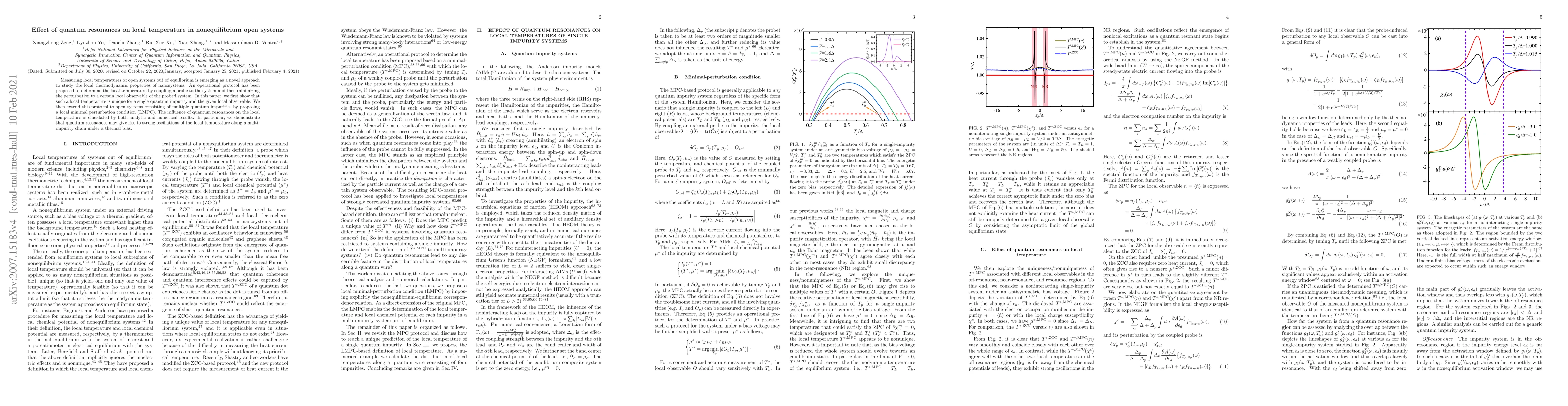 Measuring local temperatures of open systems out of equilibrium is emerging as a novel approach to study the local thermodynamic properties of nanosystems. An operational protocol has been proposed to determine the local temperature by coupling a probe to the system and then minimizing the perturbation to a certain local observable of the probed system. In this paper, we first show that such a local temperature is unique for a single quantum impurity and the given local observable. We then extend this protocol to open systems consisting of multiple quantum impurities by proposing a local minimal perturbation condition (LMPC). The influence of quantum resonances on the local temperature is elucidated by both analytic and numerical results. In particular, we demonstrate that quantum resonances may give rise to strong oscillations of the local temperature along a multiimpurity chain under a thermal bias.