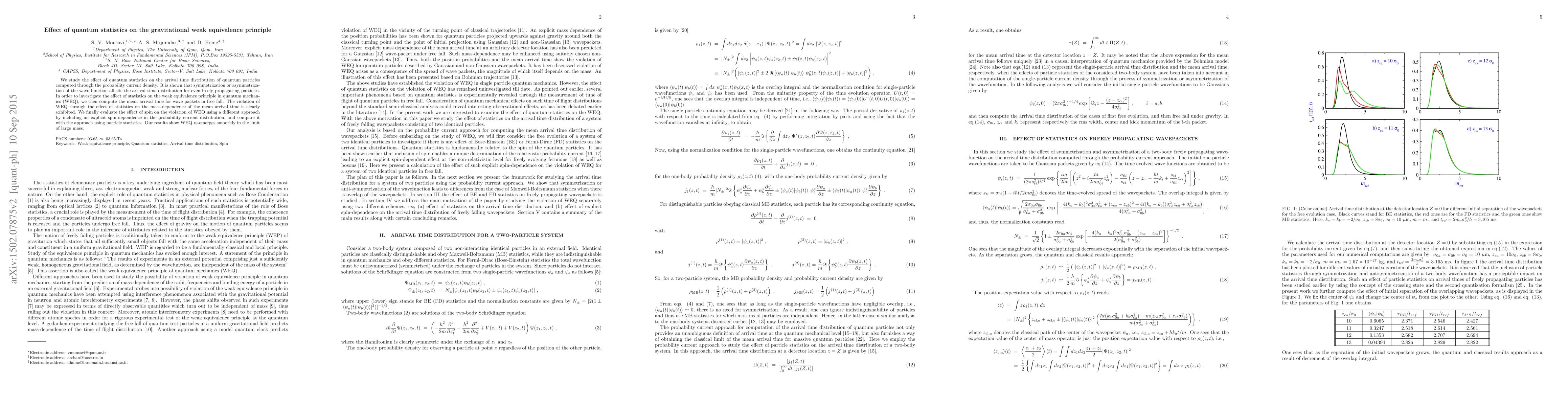 This paper investigates how quantum statistics influence the weak equivalence principle (WEQ) in quantum mechanics, revealing that symmetrization or asymmetrization of wave functions affects arrival time distributions for freely propagating particles. The study finds that WEQ is violated due to the mass-dependent mean arrival time, with WEQ re-emerging in the large mass limit.