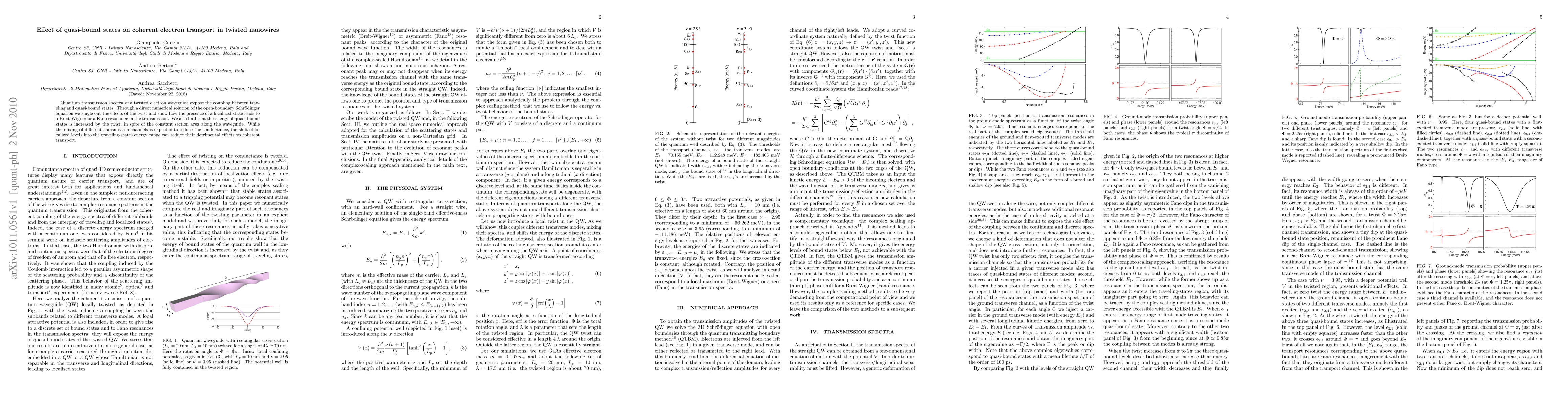 The presence of quasi-bound states in twisted nanowires can lead to Breit-Wigner or Fano resonances, increasing their energy despite a constant waveguide area. This shift can reduce the detrimental effects on coherent transport by mixing different transmission channels.