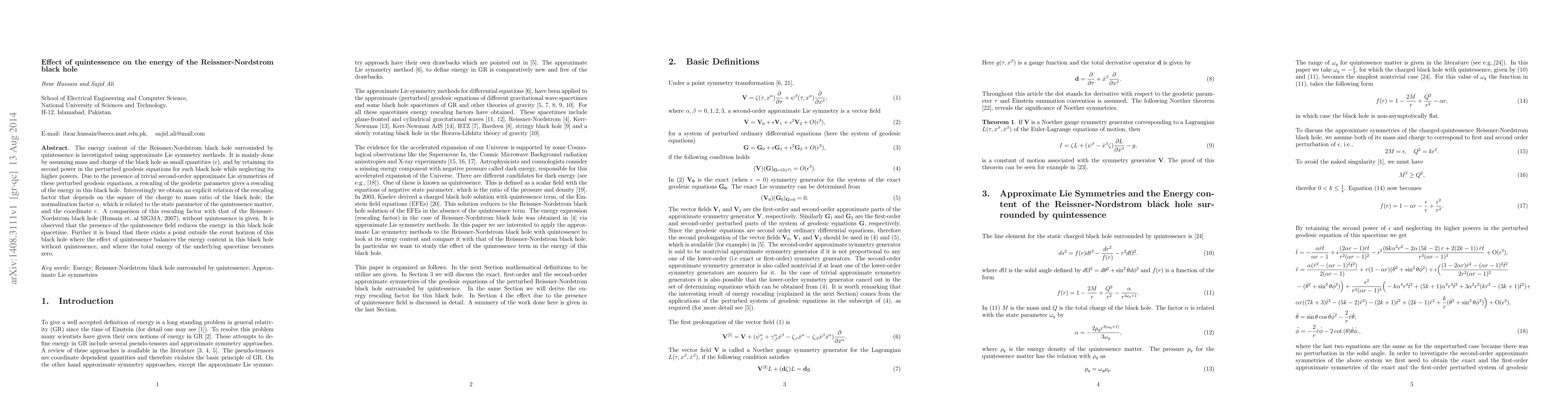The energy content of the Reissner-Nordstrom black hole surrounded by quintessence is investigated using approximate Lie symmetry methods. It is mainly done by assuming mass and charge of the black hole as small quantities ($\epsilon$), and by retaining its second power in the perturbed geodesic equations for such black hole while neglecting its higher powers. Due to the presence of trivial second-order approximate Lie symmetries of these perturbed geodesic equations, a rescaling of the geodetic parameter gives a rescaling of the energy in this black hole. Interestingly we obtain an explicit relation of the rescaling factor that depends on the square of the charge to mass ratio of the black hole, the normalization factor $\alpha$, which is related to the state parameter of the quintessence matter, and the coordinate $r$. A comparison of this rescaling factor with that of the Reissner-Nordstrom black hole (Hussain et. al SIGMA, 2007), without quintessence is given. It is observed that the presence of the quintessence field reduces the energy in this black hole spacetime. Further it is found that there exists a point outside the event horizon of this black hole where the effect of quintessence balances the energy content in this black hole without quintessence, and where the total energy of the underlying spacetime becomes zero.