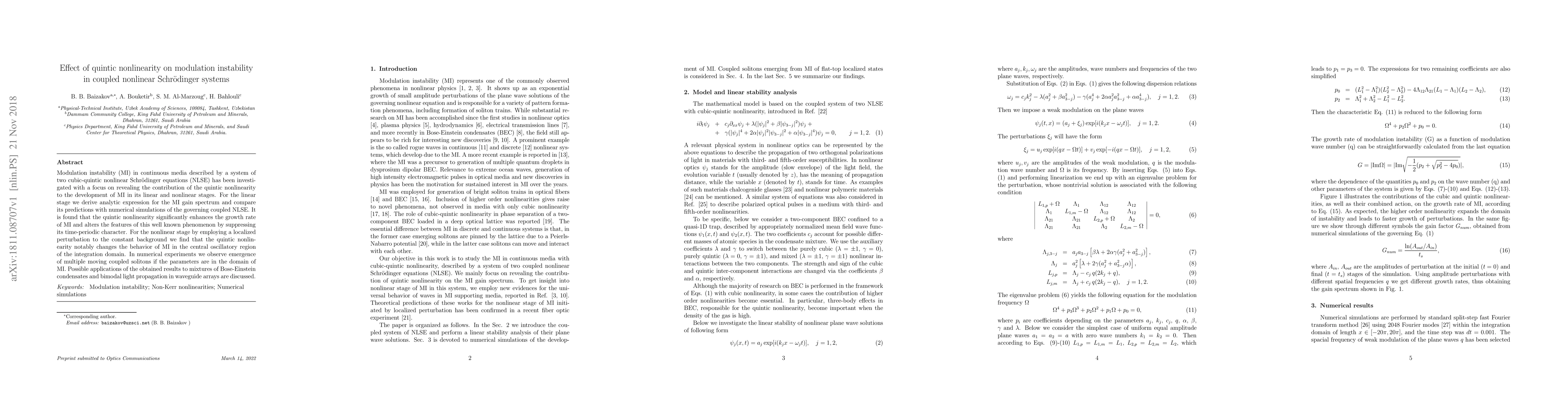 This paper investigates modulation instability in coupled nonlinear Schrödinger systems, highlighting the quintic nonlinearity's role in enhancing the growth rate and altering MI's characteristics. The study reveals that quintic nonlinearity suppresses time-periodic behavior and leads to the emergence of multiple solitons.