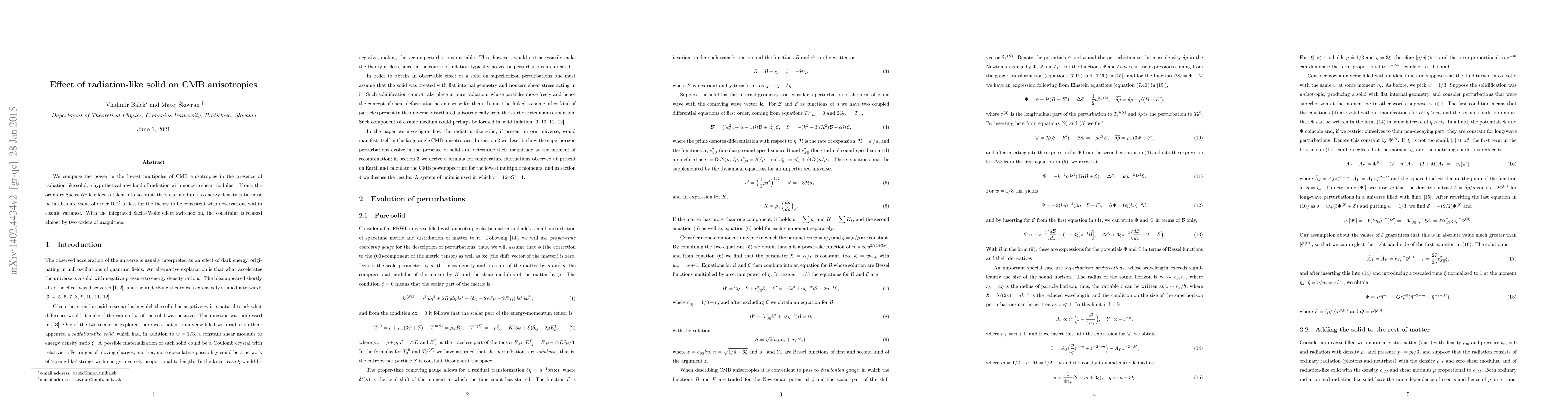 We compute the power in the lowest multipoles of CMB anisotropies in the presence of radiation-like solid, a hypothetical new kind of radiation with nonzero shear modulus. If only the ordinary Sachs-Wolfe effect is taken into account, the shear modulus to energy density ratio must be in absolute value of order $10^{-5}$ or less for the theory to be consistent with observations within cosmic variance. With the integrated Sachs-Wolfe effect switched on, the constraint is relaxed almost by two orders of magnitude.