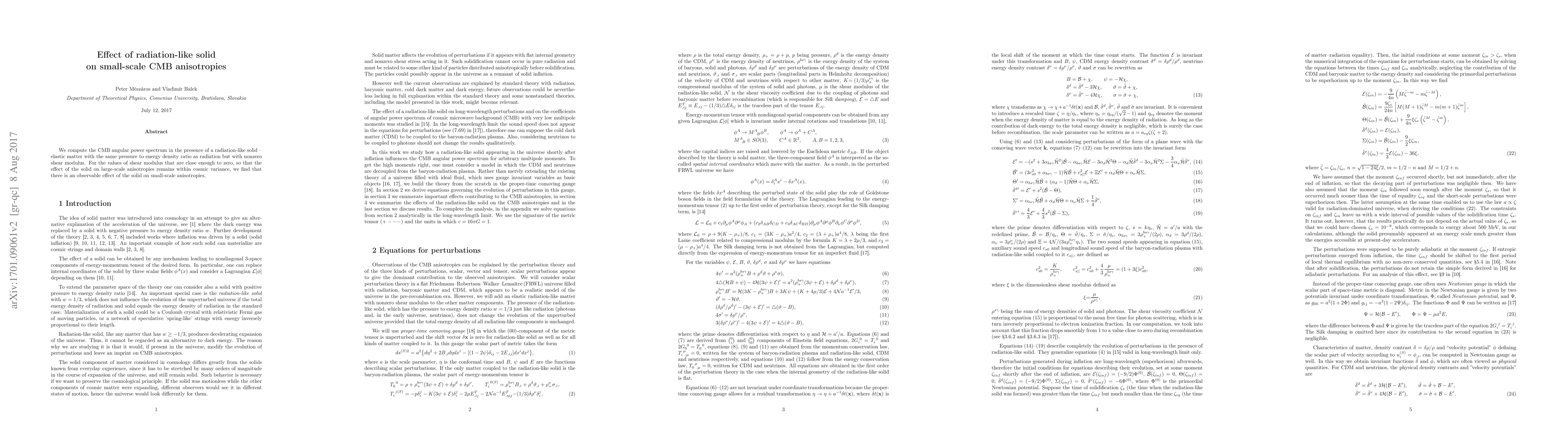 We compute the CMB angular power spectrum in the presence of a radiation-like solid - elastic matter with the same pressure to energy density ratio as radiation but with nonzero shear modulus. For the values of shear modulus that are close enough to zero, so that the effect of the solid on large-scale anisotropies remains within cosmic variance, we find that there is an observable effect of the solid on small-scale anisotropies.