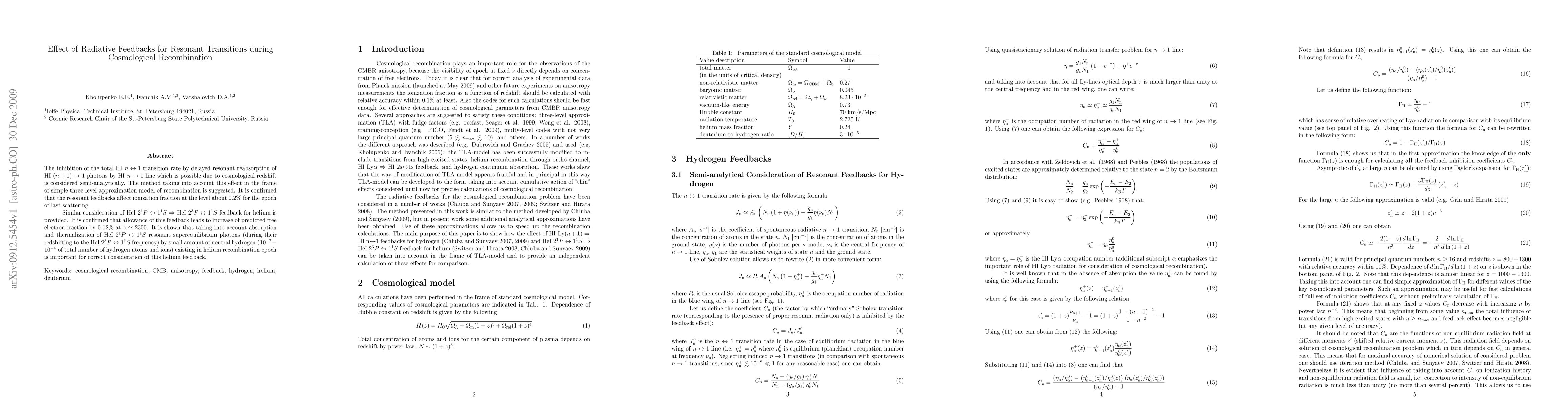 The inhibition of the total HI $n\leftrightarrow 1$ transition rate by delayed resonant reabsorption of HI $(n+1)\to 1$ photons by HI $n\to 1$ line which is possible due to cosmological redshift is considered semi-analytically. The method taking into account this effect in the frame of simple three-level approximation model of recombination is suggested. It is confirmed that the resonant feedbacks affect ionization fraction at the level about 0.2% for the epoch of last scattering. Similar consideration of HeI $2^1P\leftrightarrow 1^1S$ $\Rightarrow$ HeI $2^3P\leftrightarrow 1^1S$ feedback for helium is provided. It is confirmed that allowance of this feedback leads to increase of predicted free electron fraction by 0.12% at $z\simeq 2300$. It is shown that taking into account absorption and thermalization of HeI $2^1P\leftrightarrow 1^1S$ resonant superequilibrium photons (during their redshifting to the HeI $2^3P\leftrightarrow 1^1S$ frequency) by small amount of neutral hydrogen ($10^{\rm -7} - 10^{\rm -4}$ of total number of hydrogen atoms and ions) existing in helium recombination epoch is important for correct consideration of this helium feedback.