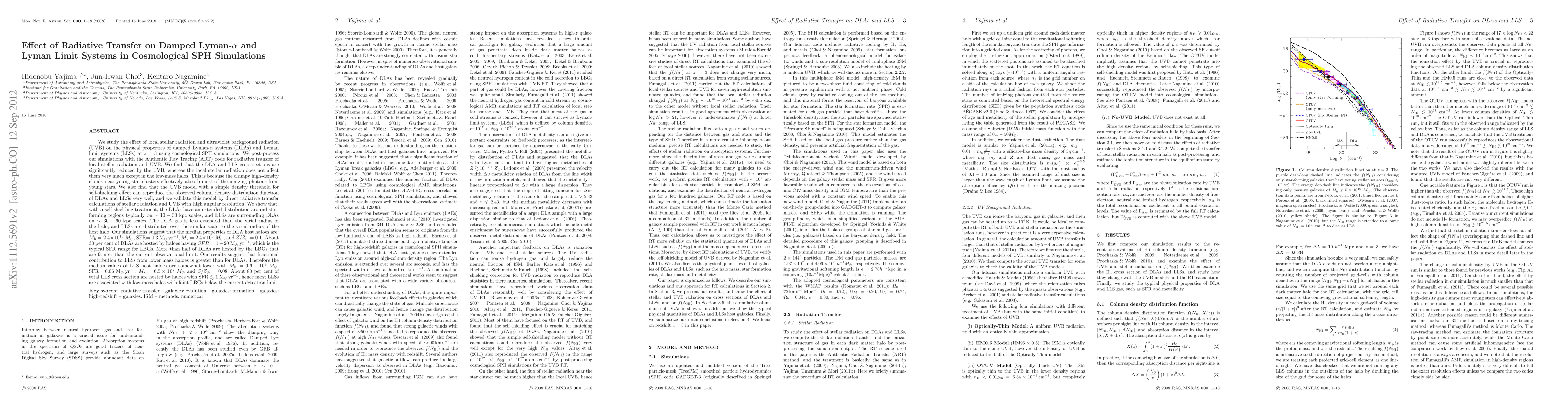 We study the effect of local stellar radiation and UVB on the physical properties of DLAs and LLSs at z=3 using cosmological SPH simulations. We post-process our simulations with the ART code for radiative transfer of local stellar radiation and UVB. We find that the DLA and LLS cross sections are significantly reduced by the UVB, whereas the local stellar radiation does not affect them very much except in the low-mass halos. This is because clumpy high-density clouds near young star clusters effectively absorb most of the ionizing photons from young stars. We also find that the UVB model with a simple density threshold for self-shielding effect can reproduce the observed column density distribution function of DLAs and LLSs very well, and we validate this model by direct radiative transfer calculations of stellar radiation and UVB with high angular resolution. We show that, with a self-shielding treatment, the DLAs have an extended distribution around star-forming regions typically on ~ 10-30 kpc scales, and LLSs are surrounding DLAs on ~ 30-60 kpc scales. Our simulations suggest that the median properties of DLA host haloes are: Mh = 2.4*10^10 Msun, SFR = 0.3 Msun/yr, M* = 2.4*10^8 Msun, and Z/Zsun = 0.1. About 30 per cent of DLAs are hosted by haloes having SFR = 1 - 20 Msun/yr, which is the typical SFR range for LBGs. More than half of DLAs are hosted by the LBGs that are fainter than the current observational limit. Our results suggest that fractional contribution to LLSs from lower mass haloes is greater than for DLAs. Therefore the median values of LLS host haloes are somewhat lower with Mh = 9.6*10^9 Msun, SFR = 0.06 Msun/yr, M* = 6.5*10^7 Msun and Z/Zsun = 0.08. About 80 per cent of total LLS cross section are hosted by haloes with SFR < 1 Msun/yr, hence most LLSs are associated with low-mass halos with faint LBGs below the current detection limit.