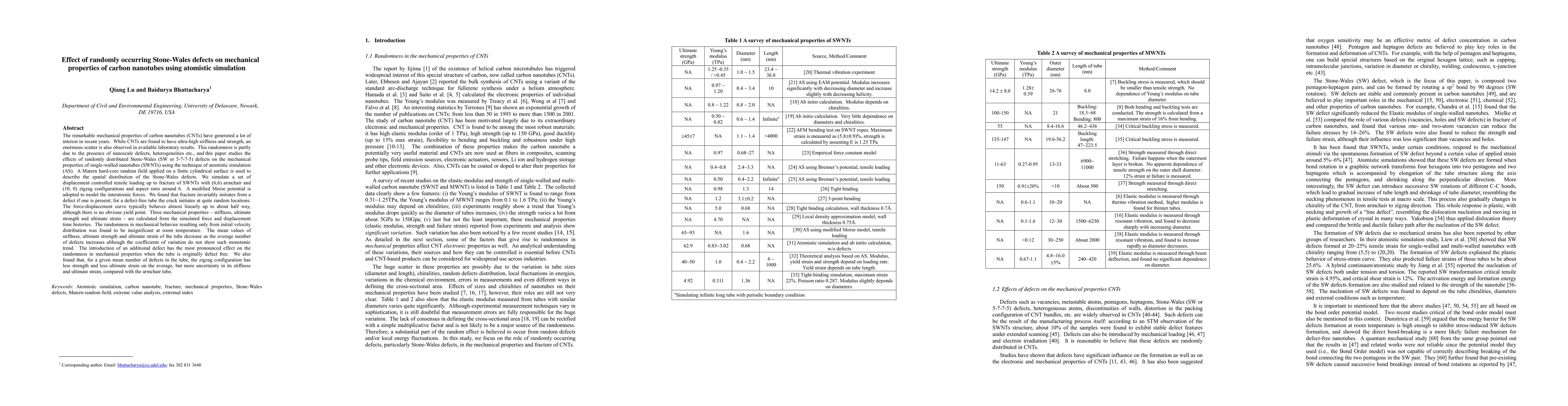 This paper investigates the impact of randomly occurring Stone-Wales defects on the mechanical properties of carbon nanotubes using atomistic simulation. The study reveals that defects significantly reduce stiffness, ultimate strength, and ultimate strain, with the zigzag configuration showing less strength and more variability compared to the armchair configuration.