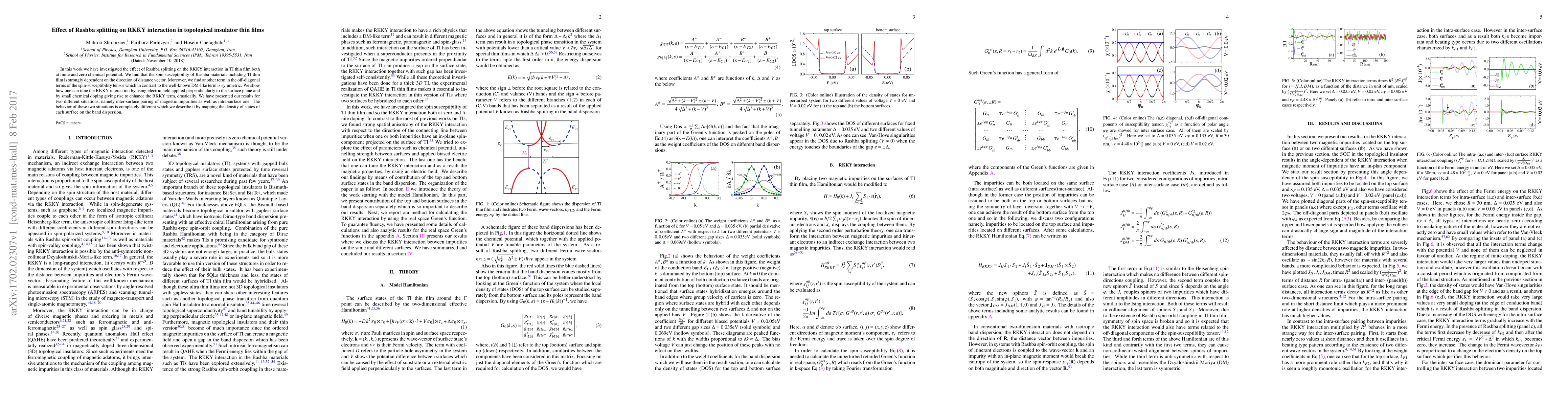 In this work we have investigated the effect of Rashba splitting on the RKKY interaction in TI thin film both at finite and zero chemical potential. We find that the spin susceptibility of Rashba materials including TI thin film is strongly dependent on the direction of distance vector. Moreover, we find another term in the off-diagonal terms of the spin-susceptibility tensor which in contrast to the well-known DM-like term is symmetric. We show how one can tune the RKKY interaction by using electric field applied perpendicularly to the surface plane and by small chemical doping giving rise to enhance the RKKY term, drastically. We have presented our results for two different situations, namely inter-surface pairing of magnetic impurities as well as intra-surface one. The behavior of these two situations is completely different which we describe it by mapping the density of states of each surface on the band dispersion.