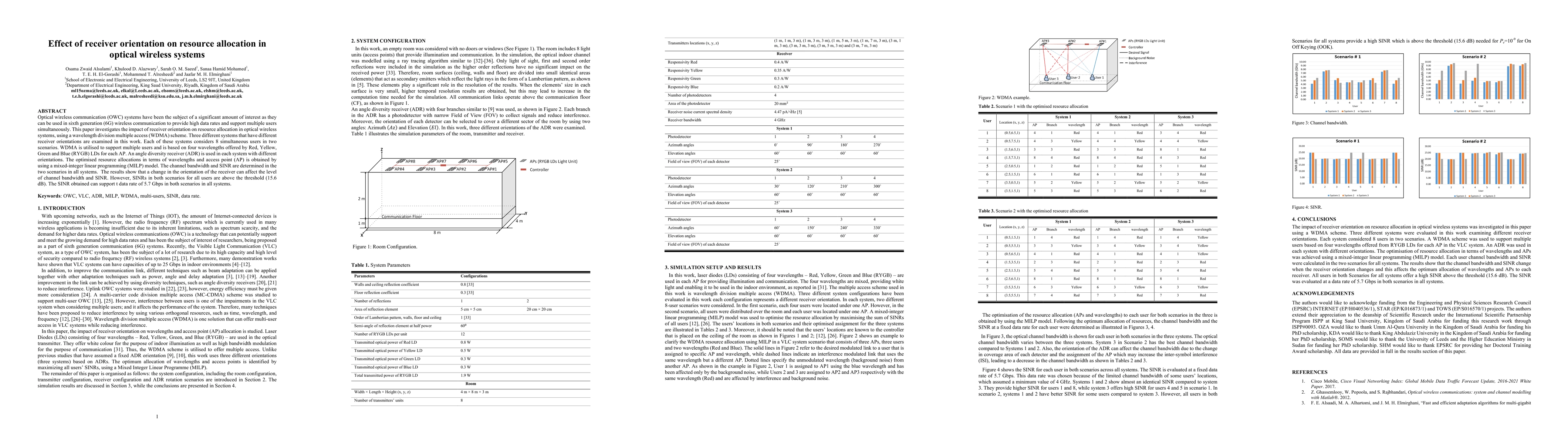 This paper examines how receiver orientation impacts resource allocation in optical wireless communication systems using a WDMA scheme. Results show that changes in receiver orientation affect channel bandwidth and SINR, though SINR remains above the threshold, supporting a data rate of 5.7 Gbps.