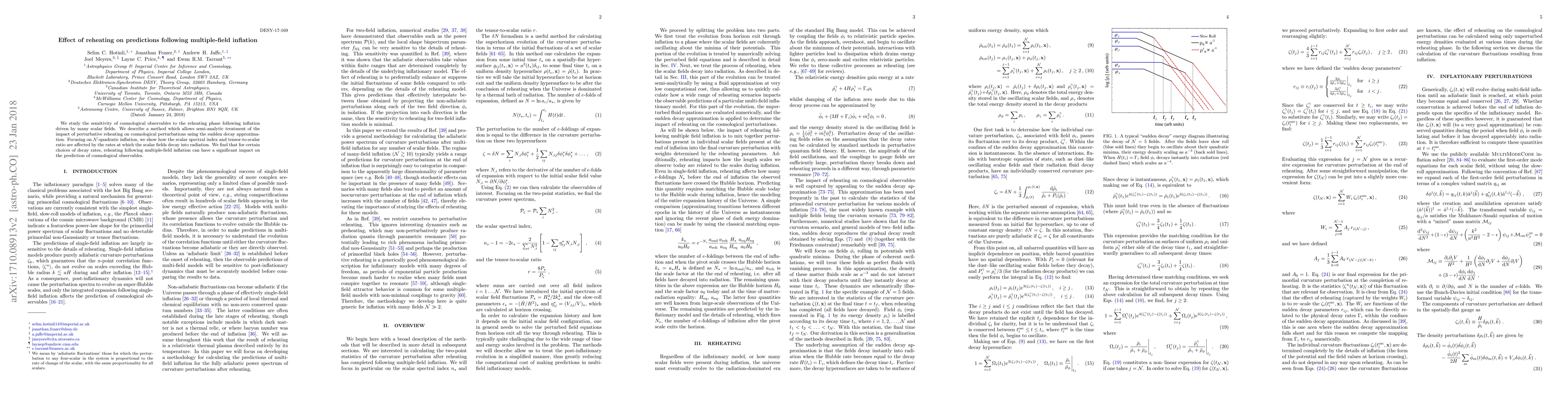 We study the sensitivity of cosmological observables to the reheating phase following inflation driven by many scalar fields. We describe a method which allows semi-analytic treatment of the impact of perturbative reheating on cosmological perturbations using the sudden decay approximation. Focusing on $\mathcal{N}$-quadratic inflation, we show how the scalar spectral index and tensor-to-scalar ratio are affected by the rates at which the scalar fields decay into radiation. We find that for certain choices of decay rates, reheating following multiple-field inflation can have a significant impact on the prediction of cosmological observables.