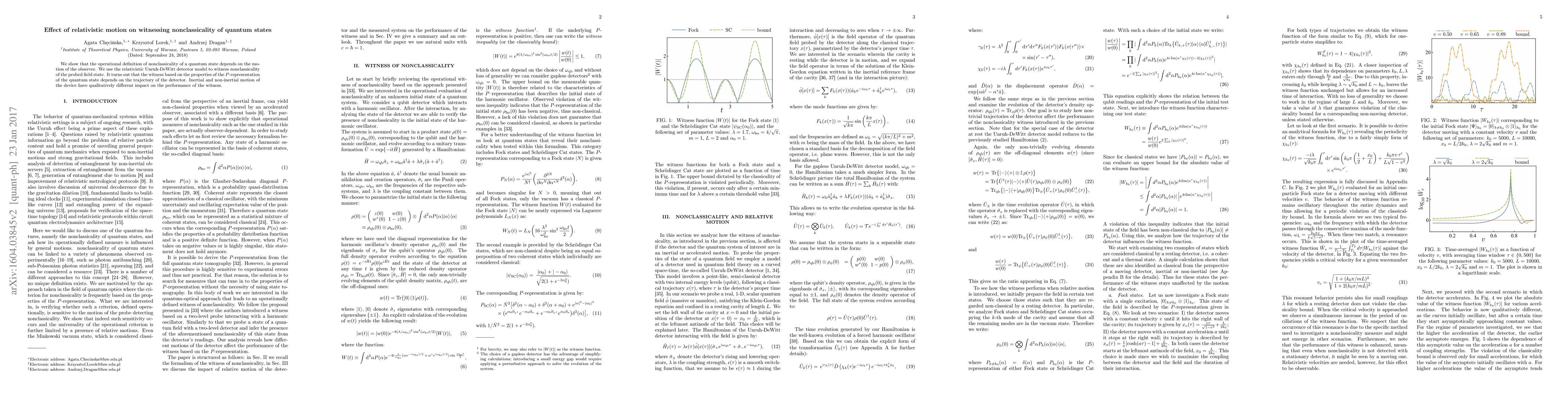 We show that the operational definition of non-classicality of a quantum state depends on the motion of the observer. We use the relativistic Unruh-DeWitt detector model to witness nonclassicality of the probed field state. It turns out that the witness based on the properties of the P-representation of the quantum state depends on the trajectory of the detector. Inertial and noninertial motion of the device have qualitatively different impact on the performance of the witness.