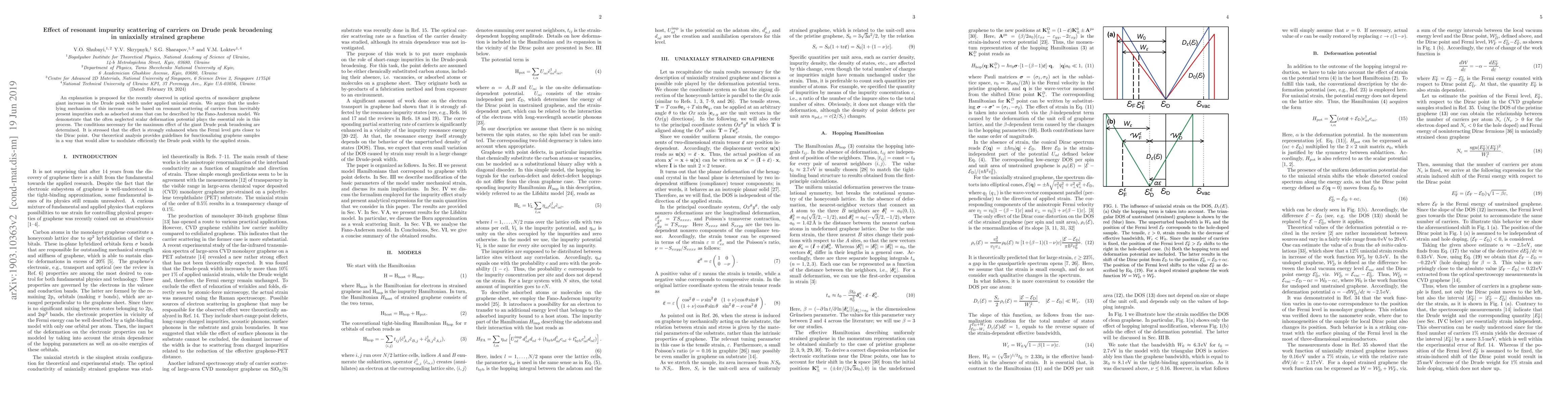 The paper presents a detailed theoretical analysis using the Fano-Anderson model and approximations, providing insights into how resonant impurity scattering affects Drude peak broadening under uniaxial strain in graphene.