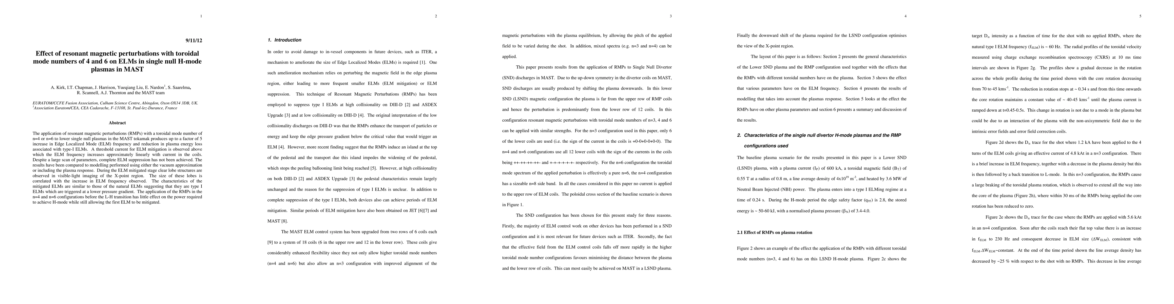 This study investigates the impact of resonant magnetic perturbations with toroidal mode numbers of 4 and 6 on Edge Localized Modes (ELMs) in MAST tokamak's single null H-mode plasmas, finding a significant increase in ELM frequency and reduced energy loss, though complete ELM suppression remains elusive.