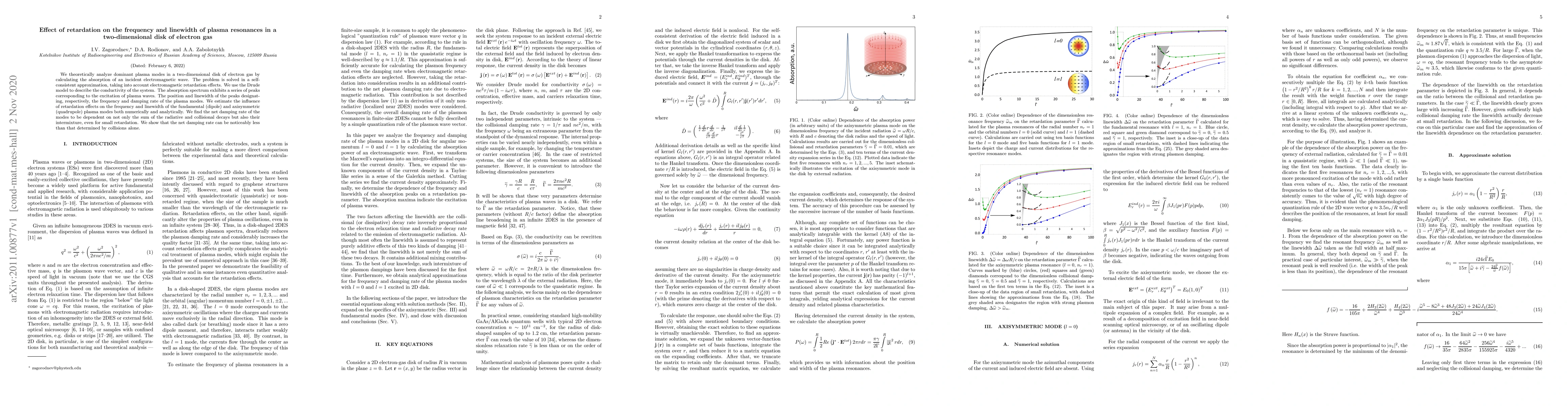 Researchers analyzed the effect of retardation on plasma resonances in a two-dimensional disk of electron gas, finding that it can reduce the damping rate of modes and lead to noticeably less decay than predicted by collisions alone.