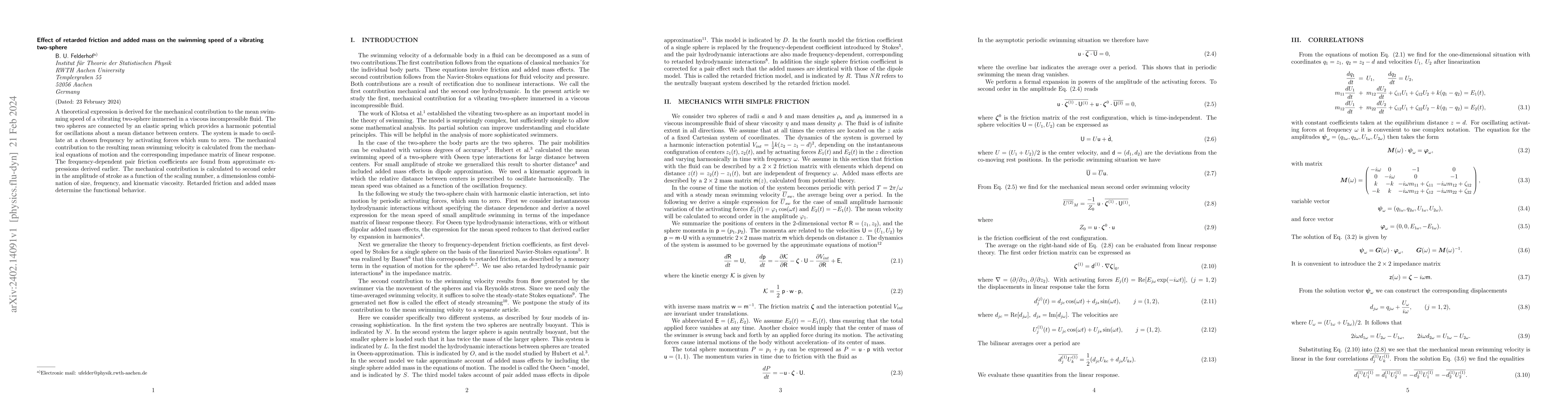 This paper derives a theoretical expression for the mean swimming speed of a vibrating two-sphere system in a viscous fluid, considering the effects of retarded friction and added mass. The study finds the frequency-dependent pair friction coefficients and calculates the swimming velocity to second order in stroke amplitude, highlighting the influence of the dimensionless scaling number.