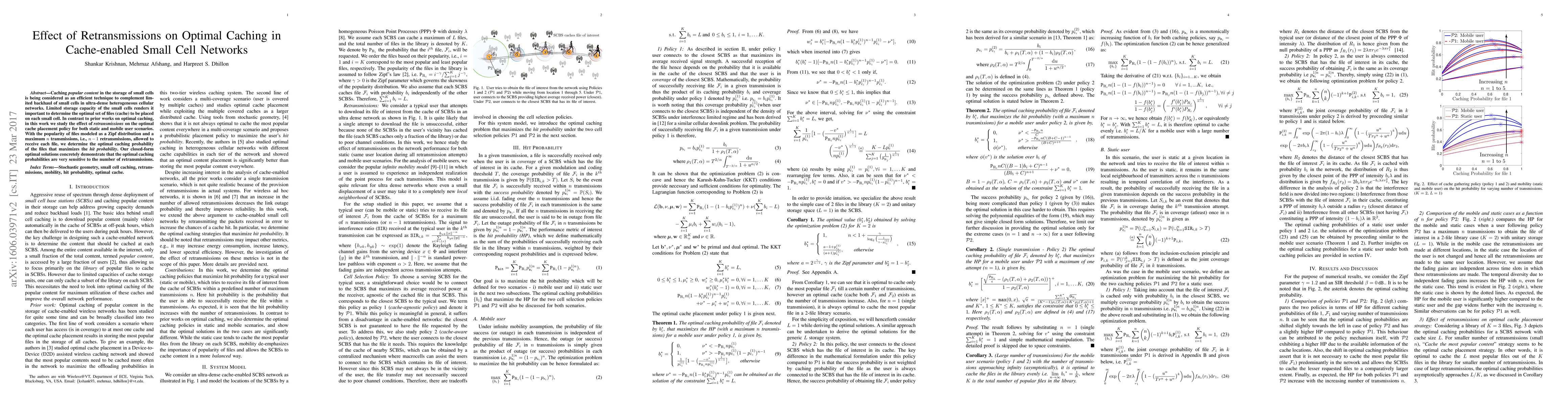 Caching popular content in the storage of small cells is being considered as an efficient technique to complement limited backhaul of small cells in ultra-dense heterogeneous cellular networks. Limited storage capacity of the small cells renders it important to determine the optimal set of files (cache) to be placed on each small cell. In contrast to prior works on optimal caching, in this work we study the effect of retransmissions on the optimal cache placement policy for both static and mobile user scenarios. With the popularity of files modeled as a Zipf distribution and a maximum n transmissions, i.e., n-1 retransmissions, allowed to receive each file, we determine the optimal caching probability of the files that maximizes the hit probability. Our closed-form optimal solutions concretely demonstrate that the optimal caching probabilities are very sensitive to the number of retransmissions.