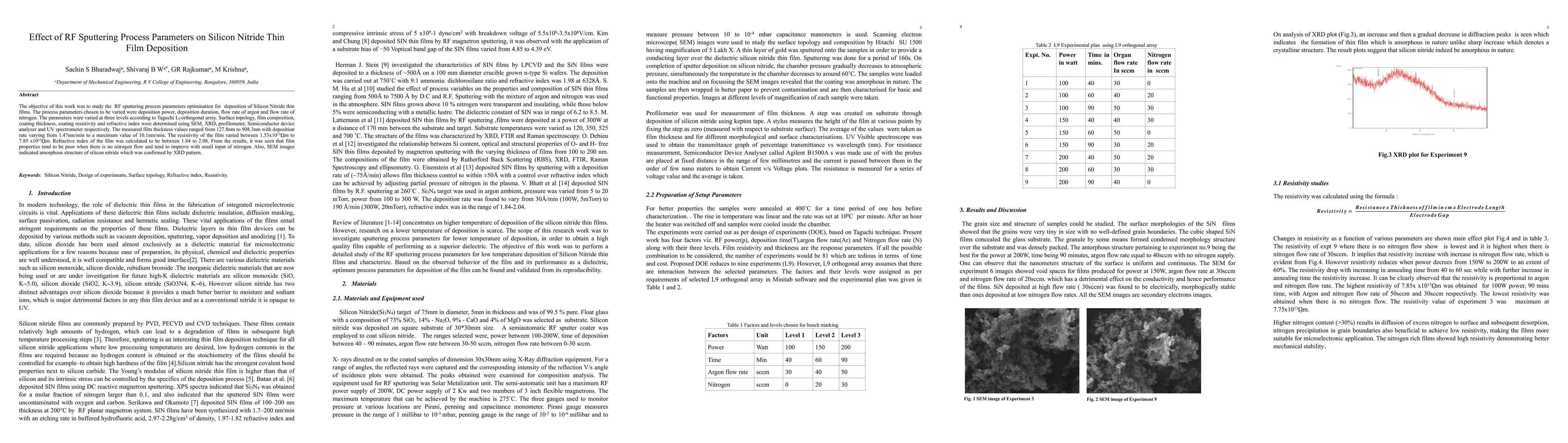 This study optimized RF sputtering parameters for Silicon Nitride thin film deposition, varying power, deposition time, and gas flow rates. Results showed film properties improve with small nitrogen input, with thickness ranging from 127.8nm to 908.3nm and resistivity between 1.53x10^13ohm-m to 7.85 x10^13ohm-m, indicating an amorphous structure.