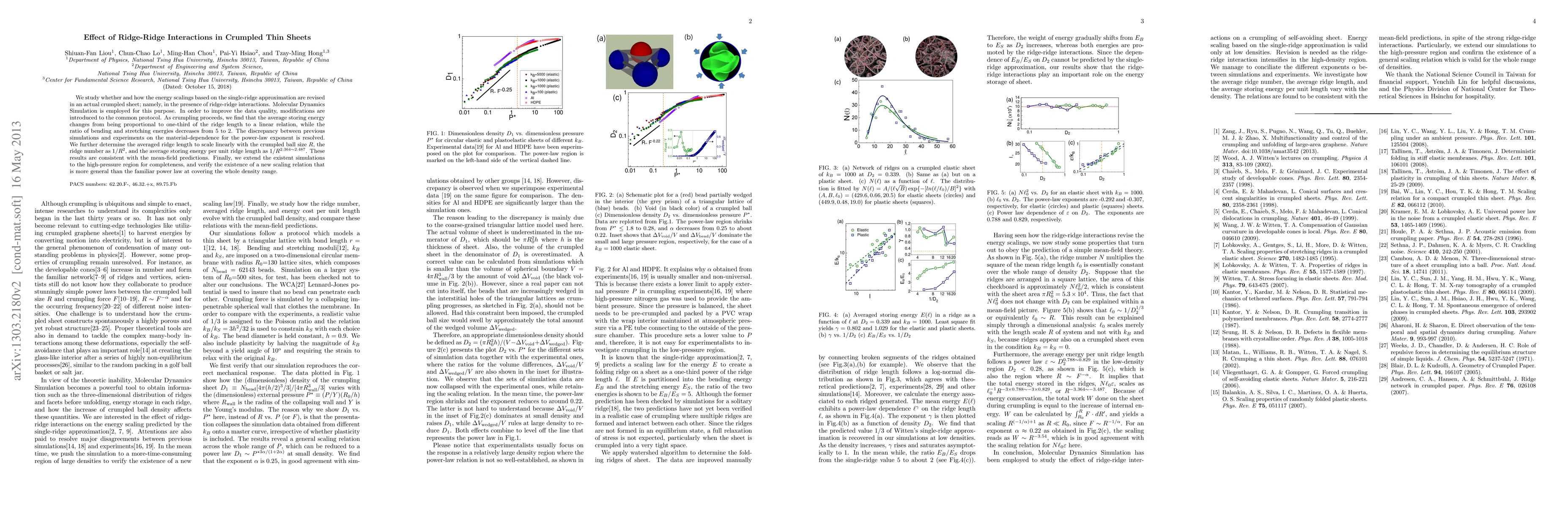 We study whether and how the energy scalings based on the single-ridge approximation are revised in an actual crumpled sheet; namely, in the presence of ridge-ridge interactions. Molecular Dynamics Simulation is employed for this purpose. In order to improve the data quality, modifications are introduced to the common protocol. As crumpling proceeds, we find that the average storing energy changes from being proportional to one-third of the ridge length to a linear relation, while the ratio of bending and stretching energies decreases from 5 to 2. The discrepancy between previous simulations and experiments on the material-dependence for the power-law exponent is resolved. We further determine the averaged ridge length to scale linearly with the crumpled ball size $R$, the ridge number as $1/R^2$, and the average storing energy per unit ridge length as $1/R^{2.364\sim 2.487}$. These results are consistent with the mean-field predictions. Finally, we extend the existent simulations to the high-pressure region for completeness, and verify the existence of a new scaling relation that is more general than the familiar power law at covering the whole density range.