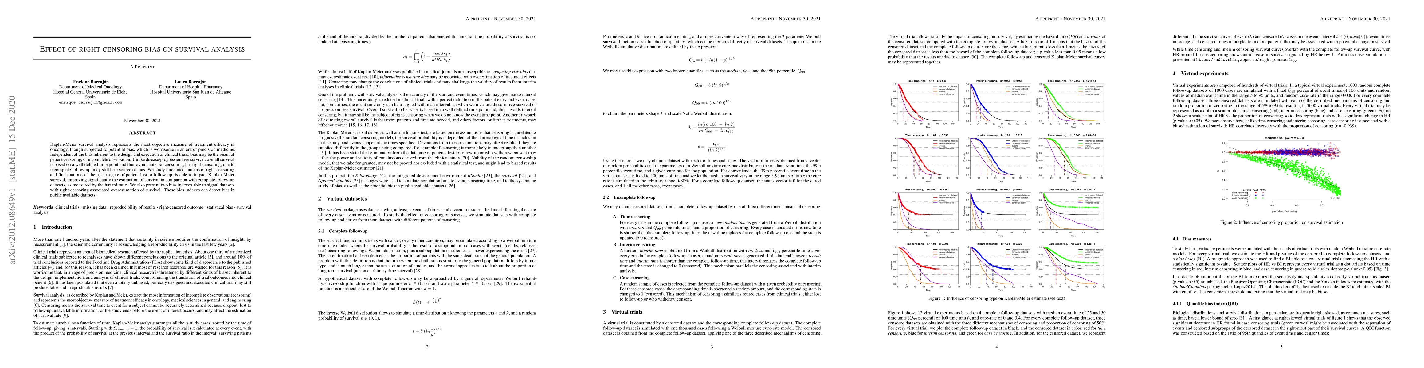 Kaplan-Meier survival analysis represents the most objective measure of treatment efficacy in oncology, though subjected to potential bias, which is worrisome in an era of precision medicine. Independent of the bias inherent to the design and execution of clinical trials, bias may be the result of patient censoring, or incomplete observation. Unlike disease/progression free survival, overall survival is based on a well defined time point and thus avoids interval censoring, but right-censoring, due to incomplete follow-up, may still be a source of bias. We study three mechanisms of right-censoring and find that one of them, surrogate of patient lost to follow-up, is able to impact Kaplan-Meier survival, improving significantly the estimation of survival in comparison with complete follow-up datasets, as measured by the hazard ratio. We also present two bias indexes able to signal datasets with right-censoring associated overestimation of survival. These bias indexes can detect bias in public available datasets