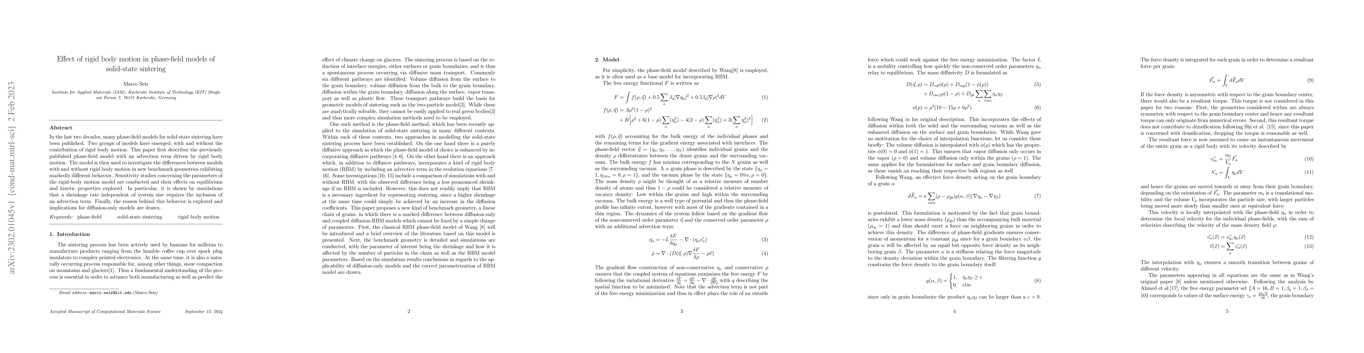 This paper investigates phase-field models for solid-state sintering, comparing models with and without rigid body motion. It demonstrates that including an advection term driven by rigid body motion is crucial for achieving a shrinkage rate independent of system size, highlighting its implications for diffusion-only models.