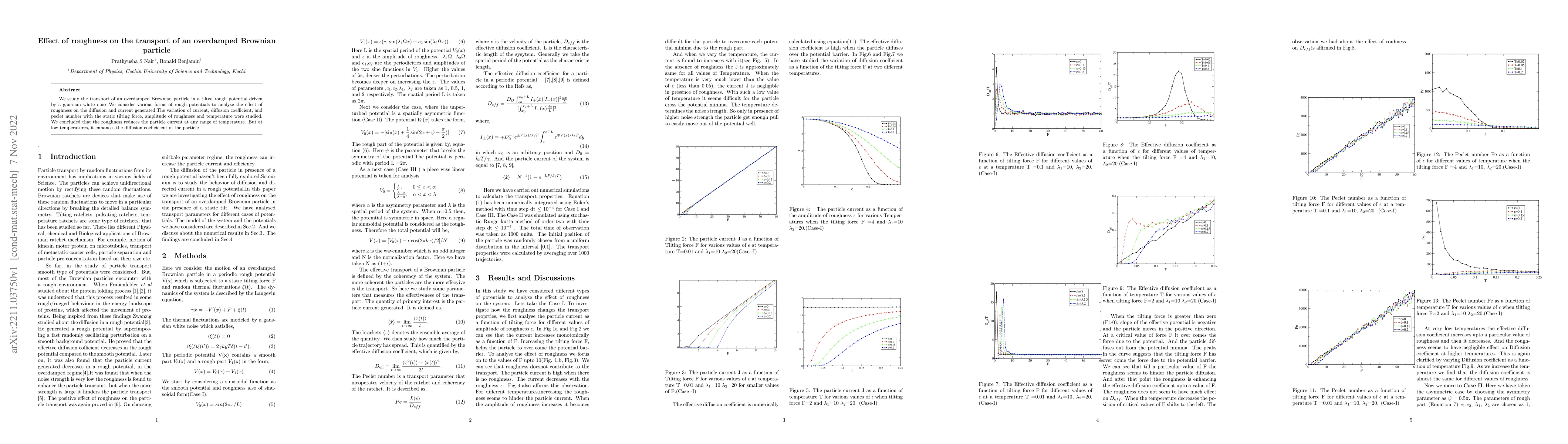 Summary: This paper investigates the transport of an overdamped Brownian particle in rough potentials, finding that roughness decreases particle current but enhances diffusion coefficient at low temperatures. The study analyzes the impact of roughness on diffusion, current, and Péclet number under varying conditions.