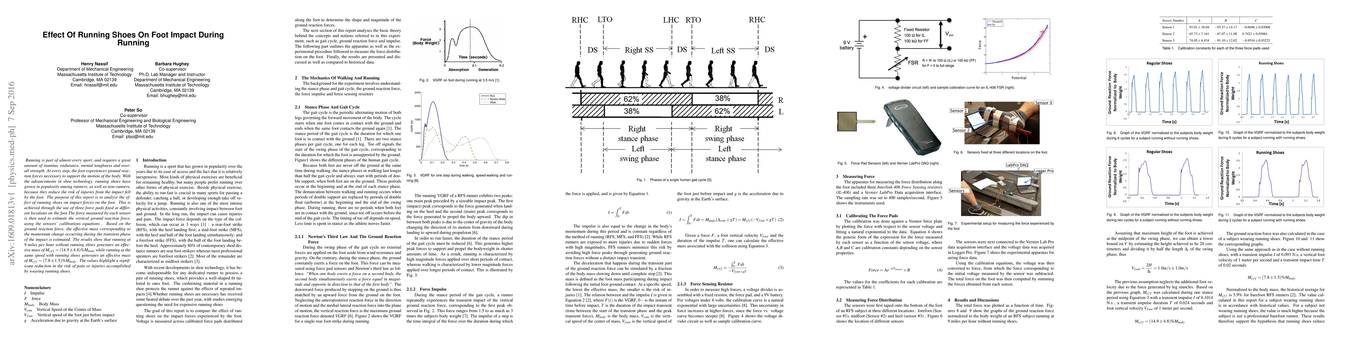 This study investigates the impact of running shoes on foot impact forces during running, finding that running shoes significantly reduce effective mass experienced by the foot, lowering injury risk by approximately 50% compared to running barefoot. The research uses force pads to measure ground reaction forces and validates results with calibration equations.