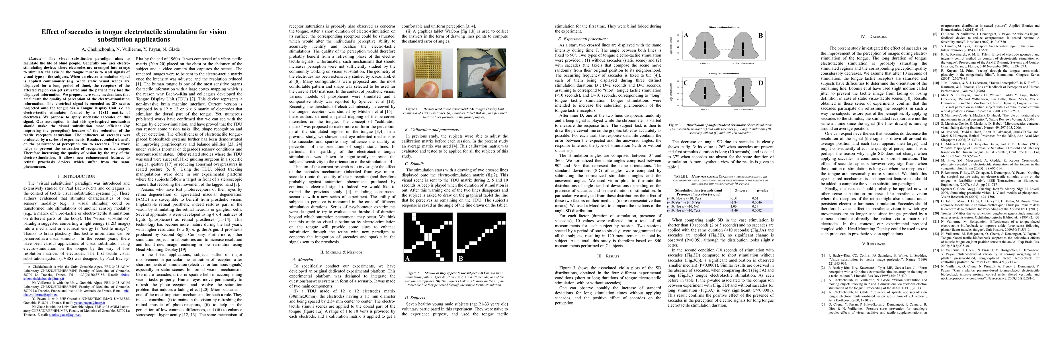 The visual substitution paradigm aims to facilitate the life of blind people. Generally one uses electro-stimulating devices where electrodes are arranged into arrays to stimulate the skin or the tongue mucosa to send signals of visual type to the subjects. When an electro-stimulation signal is applied continuously (e.g. when static visual scenes are displayed for a long period of time), the receptors of the affected region can get saturated and the patient may lose the displayed information. We propose here some mechanisms that ameliorate the quality of perception of the electro-stimulation information. The electrical signal is encoded as 2D scenes projected onto the tongue via a Tongue Display Unit, i.e. an electro-tactile stimulator formed by a 12x12 matrix of electrodes. We propose to apply stochastic saccades on this signal. Our assumption is that this eye-inspired mechanism should make the visual substitution more efficient (by improving the perception) because of the reduction of the tactile receptors saturation. The influence of saccades was evaluated by a series of experiments. Results revealed a benefit on the persistence of perception due to saccades. This work helps to prevent the saturation of receptors on the tongue. Therefore increasing the quality of vision by the way of the electro-stimulation. It allows new enhancement features to retinal prosthesis devices which suffer from the same phenomenon.