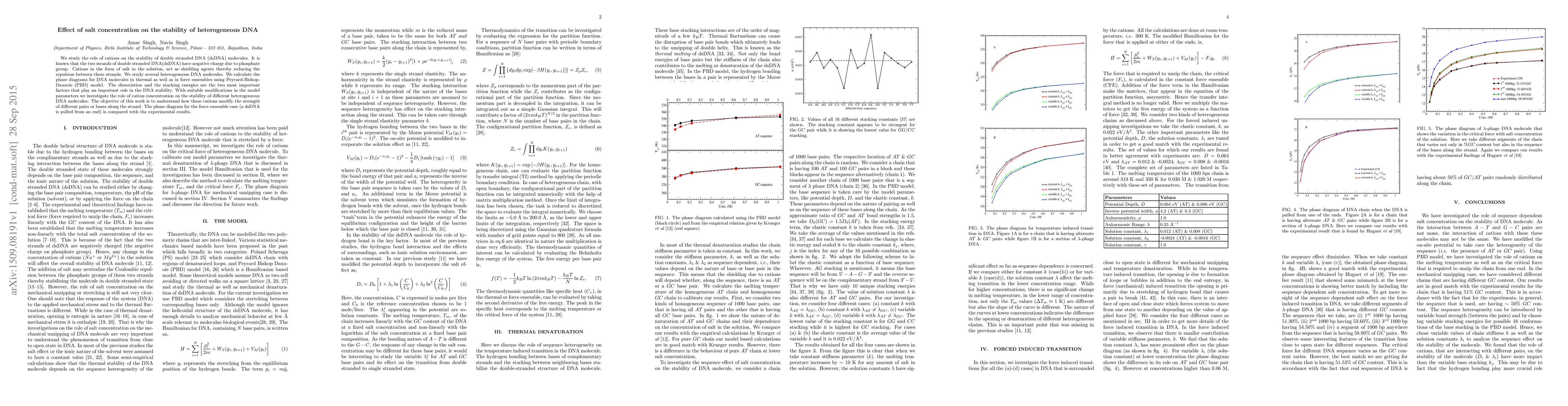This study investigates the impact of varying salt concentrations on the stability of heterogeneous DNA molecules, using the Peyrard-Bishop-Dauxois model to calculate phase diagrams. The research aims to understand how cations influence the dissociation and stacking energies, thereby modifying the strength of base pairs in DNA.