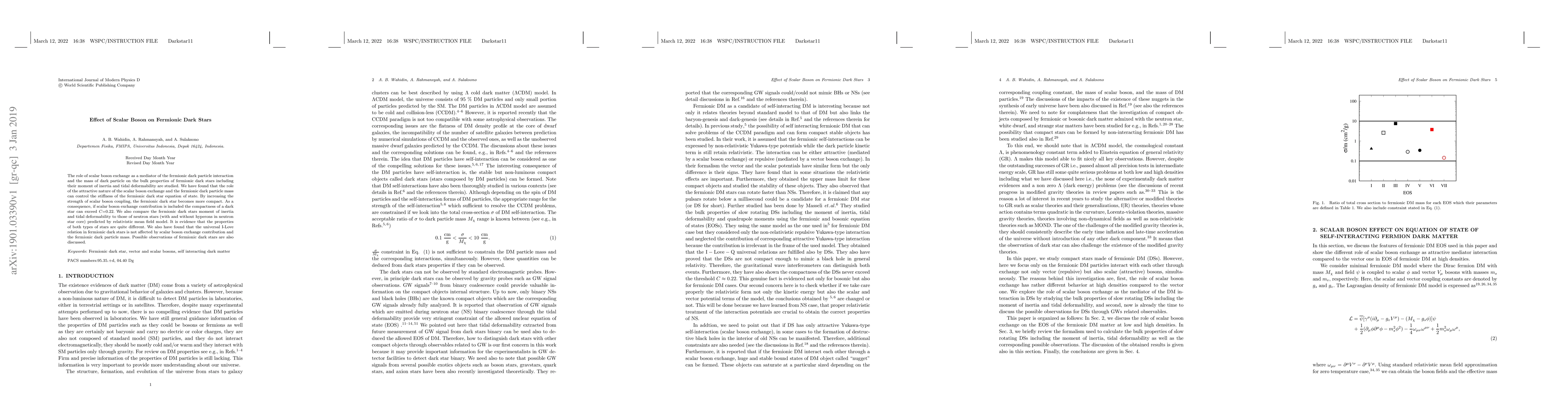 The role of scalar boson exchange as a mediator of the fermionic dark particle interaction and the mass of dark particle on the bulk properties of fermionic dark stars including their moment of inertia and tidal deformability are studied. We have found that the role of the attractive nature of the scalar boson exchange and the fermionic dark particle mass can control the stiffness of the fermionic dark star equation of state. By increasing the strength of scalar boson coupling, the fermionic dark star becomes more compact. As a consequence, if scalar boson exchange contribution is included the compactness of a dark star can exceed $C$=0.22. We also compare the fermionic dark stars moment of inertia and tidal deformability to those of neutron stars (with and without hyperons in neutron star core) predicted by relativistic mean field model. It is evidence that the properties of both types of stars are quite different. We also have found that the universal I-Love relation in fermionic dark stars is not affected by scalar boson exchange contribution and the fermionic dark particle mass. Possible observations of fermionic dark stars are also discussed.