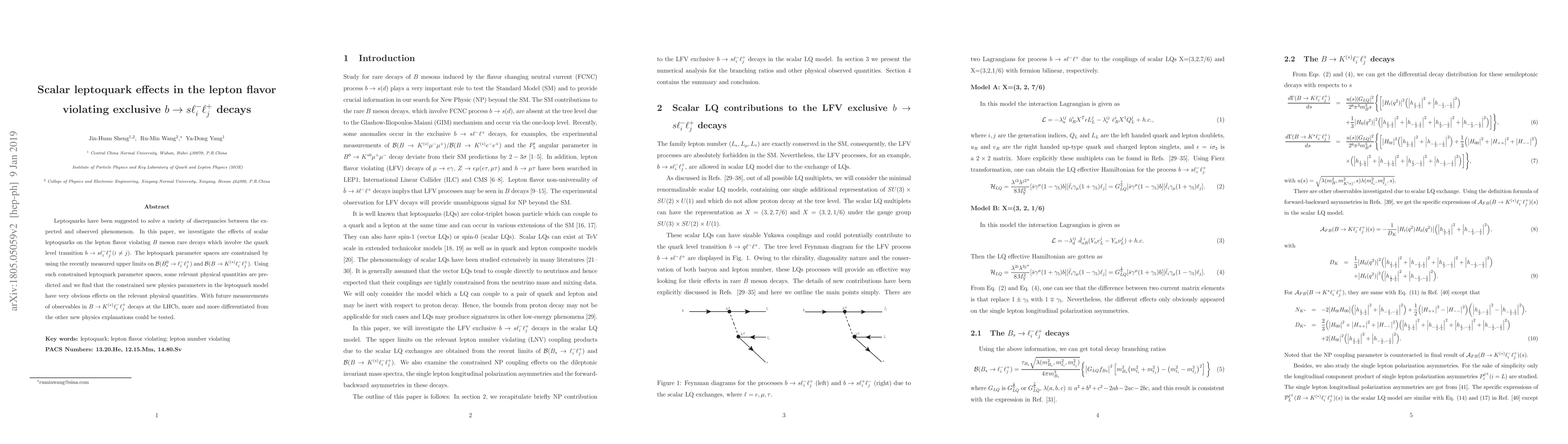 This work is notable for being among the first to study the differential forward-backward asymmetries and single lepton longitudinal polarization asymmetries of relevant LFV B decays in the scalar leptoquark model.