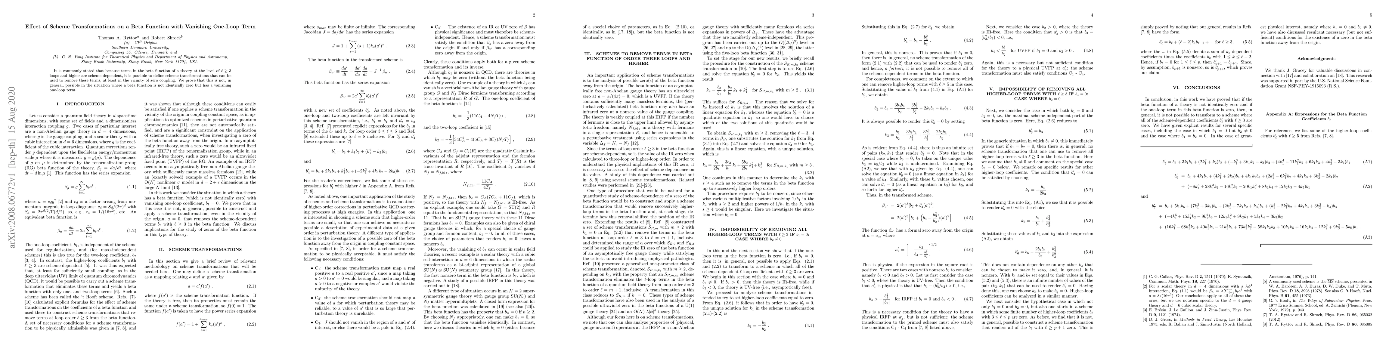 This paper demonstrates that scheme transformations cannot generally remove scheme-dependent terms in the beta function for theories where the one-loop term vanishes, despite the existence of such transformations for theories with non-zero one-loop terms.