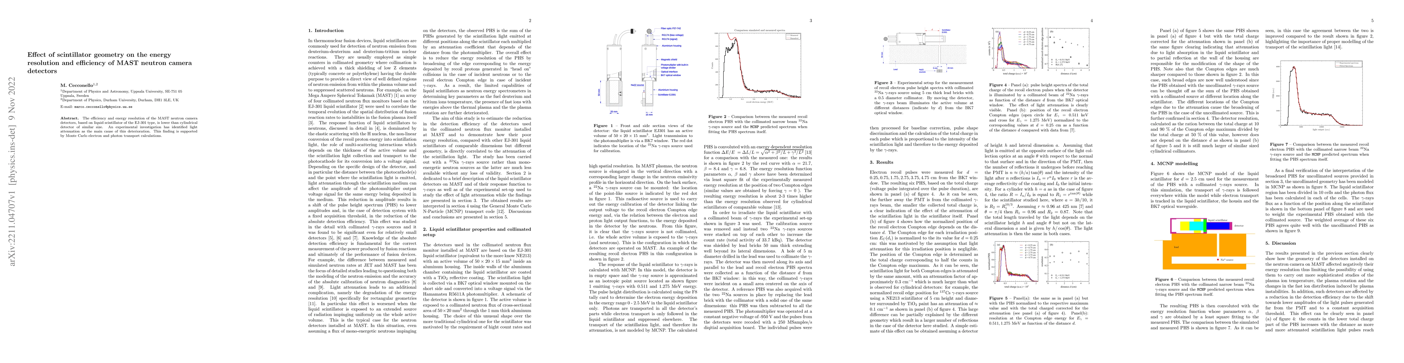 Summary: Research shows that MAST neutron camera detectors using EJ-301 liquid scintillator have lower efficiency and energy resolution than cylindrical detectors due to light attenuation, confirmed by Monte Carlo simulations.