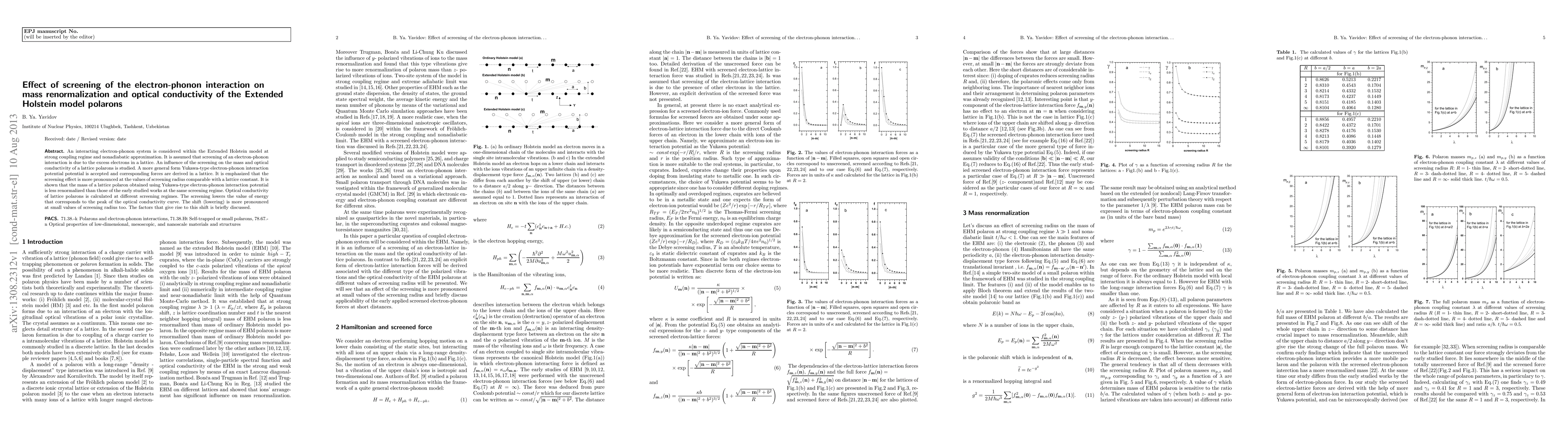 This paper investigates the impact of electron-phonon interaction screening on the mass renormalization and optical conductivity in the Extended Holstein model polarons, showing that Yukawa-type potentials lead to less mass renormalization and a significant lowering of the optical conductivity peak energy, especially at small screening radii.