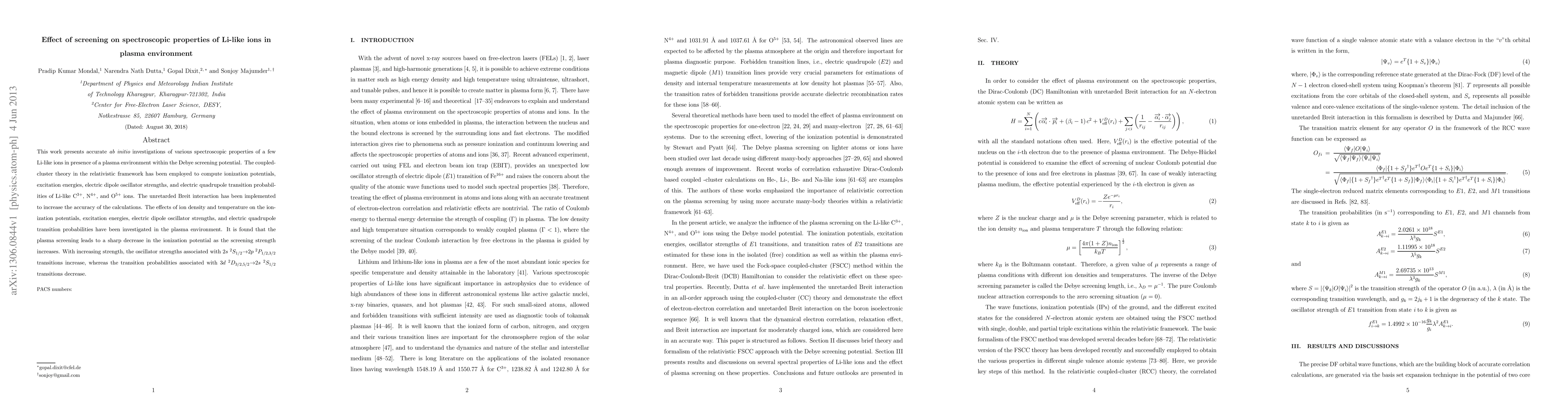 This study uses {\it ab initio} coupled-cluster theory to investigate spectroscopic properties of Li-like ions in plasma, revealing that plasma screening significantly reduces ionization potentials and alters excitation energies and transition probabilities, with increased screening strength boosting dipole oscillator strengths and diminishing quadrupole transition probabilities.