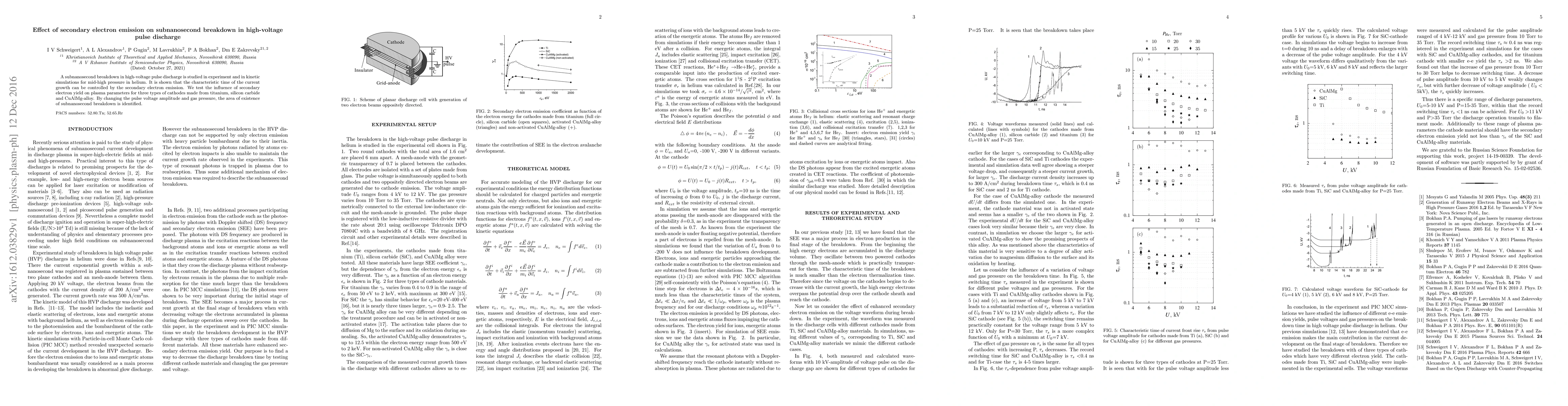 This study investigates the role of secondary electron emission in subnanosecond breakdown during high-voltage pulse discharge in helium, revealing that the current growth time is influenced by this emission. Experiments and simulations identify the impact of different cathode materials on plasma parameters and determine the conditions for subnanosecond breakdown.