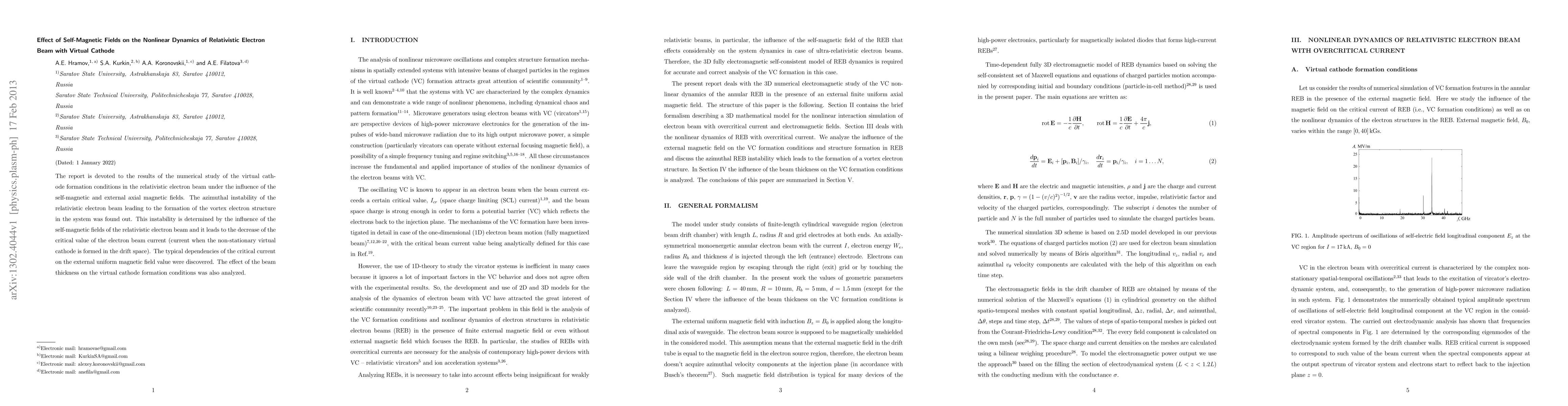 This paper investigates the nonlinear dynamics of relativistic electron beams with virtual cathodes, revealing that self-magnetic fields induce azimuthal instability, leading to vortex structures and reducing the critical current for virtual cathode formation. The study also found dependencies of this critical current on external magnetic fields and analyzed the effect of beam thickness.