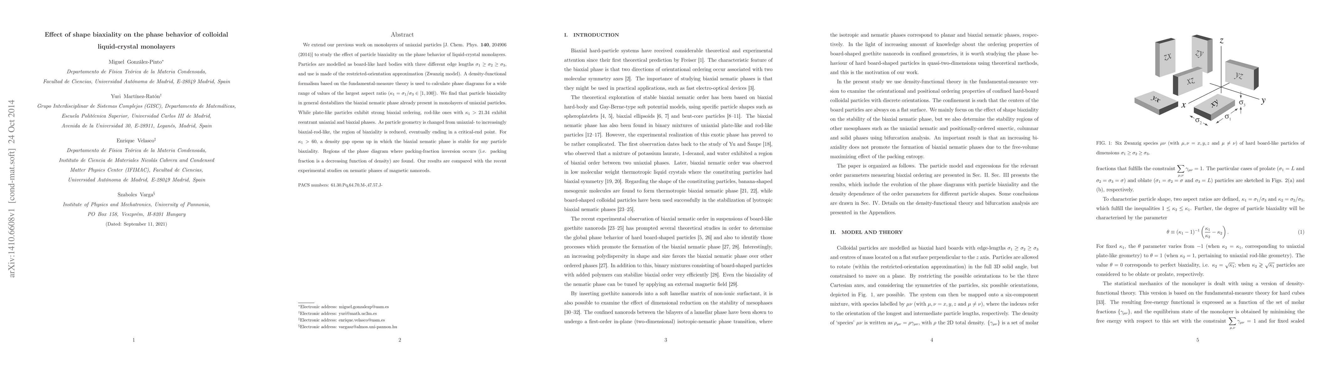 This study investigates how biaxial particle shapes affect the phase behavior of colloidal liquid-crystal monolayers, finding that biaxiality generally destabilizes the biaxial nematic phase. It reveals that rod-like particles with high aspect ratios exhibit reentrant uniaxial and biaxial phases, while plate-like particles show strong biaxial ordering.