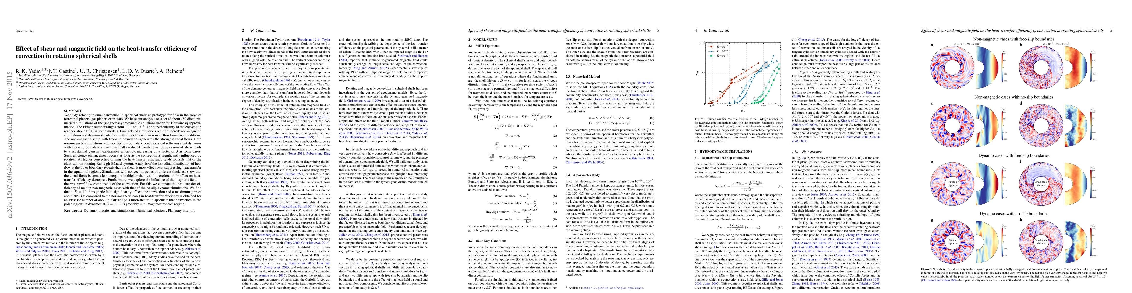 We study rotating thermal convection in spherical shells. We base our analysis on a set of about 450 direct numerical simulations of the (magneto)hydrodynamic equations under the Boussinesq approximation. The Ekman number ranges from $10^{-3}$ to $10^{-5}$. The supercriticality of the convection reaches about 1000 in some models. Four sets of simulations are considered: non-magnetic simulations and dynamo simulations with either free-slip or no-slip flow boundary conditions. The non-magnetic setup with free-slip boundaries generates the strongest zonal flows. Both non-magnetic simulations with no-slip flow boundary conditions and self-consistent dynamos with free-slip boundaries have drastically reduced zonal-flows. Suppression of shear leads to a substantial gain in heat-transfer efficiency, increasing by a factor of 3 in some cases. Such efficiency enhancement occurs as long as the convection is significantly influenced by rotation. At higher convective driving the heat-transfer efficiency tends towards that of the classical non-rotating Rayleigh-B\'enard system. Analysis of the latitudinal distribution of heat flow at the outer boundary reveals that the shear is most effective at suppressing heat-transfer in the equatorial regions. Furthermore, we explore the influence of the magnetic field on the {\em non-zonal} flow components of the convection. For this we compare the heat-transfer efficiency of no-slip non-magnetic cases with that of the no-slip dynamo simulations. We find that at $E=10^{-5}$ magnetic field significantly affects the convection and a maximum gain of about 30\% (as compared to the non-magnetic case) in heat-transfer efficiency is obtained for an Elsasser number of about 3. Our analysis motivates us to speculate that convection in the polar regions in dynamos at $E=10^{-5}$ is probably in a `magnetostrophic' regime.