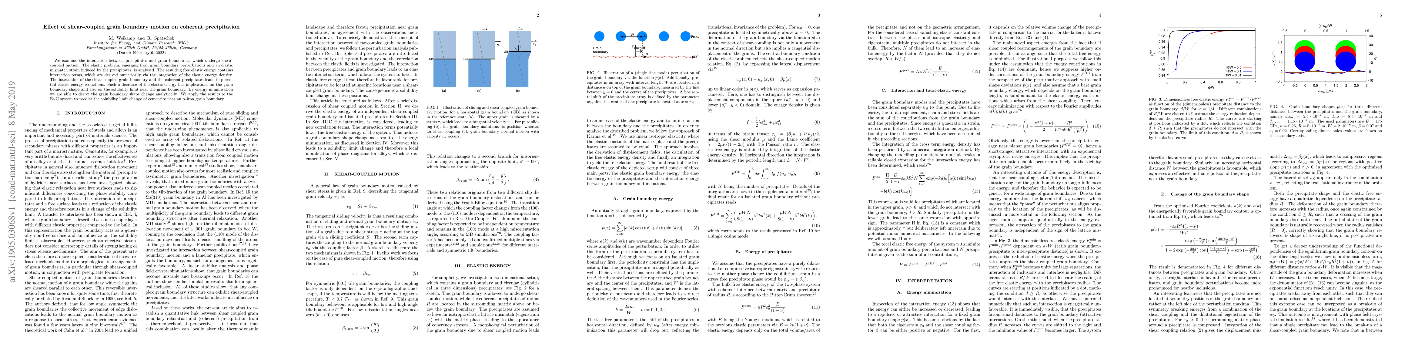 This paper investigates how shear-coupled grain boundary motion affects coherent precipitates, deriving interaction terms from the elastic energy and predicting changes in the solubility limit of cementite near an $\alpha$-iron grain boundary in the Fe-C system. The study finds that the interaction leads to reductions in elastic energy, influencing grain boundary shape and solubility limits.