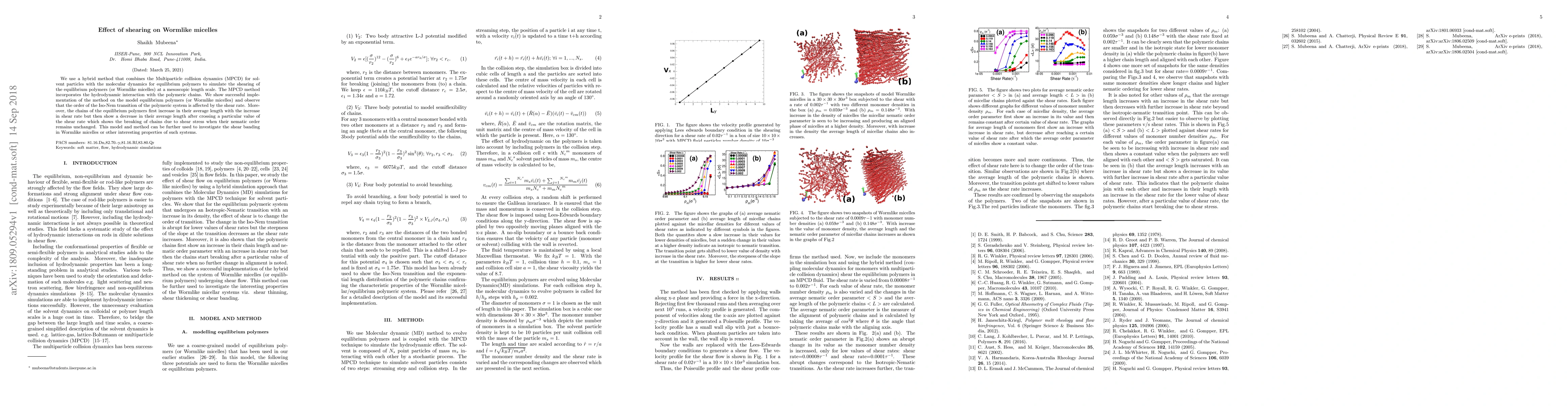 This study combines Multiparticle collision dynamics and molecular dynamics to simulate the shear flow on Wormlike micelles, revealing that shear rate affects the Iso-Nem transition and causes initial chain lengthening followed by breaking at higher shear rates, maintaining nematic order. The method can further explore shear banding and properties in such systems.