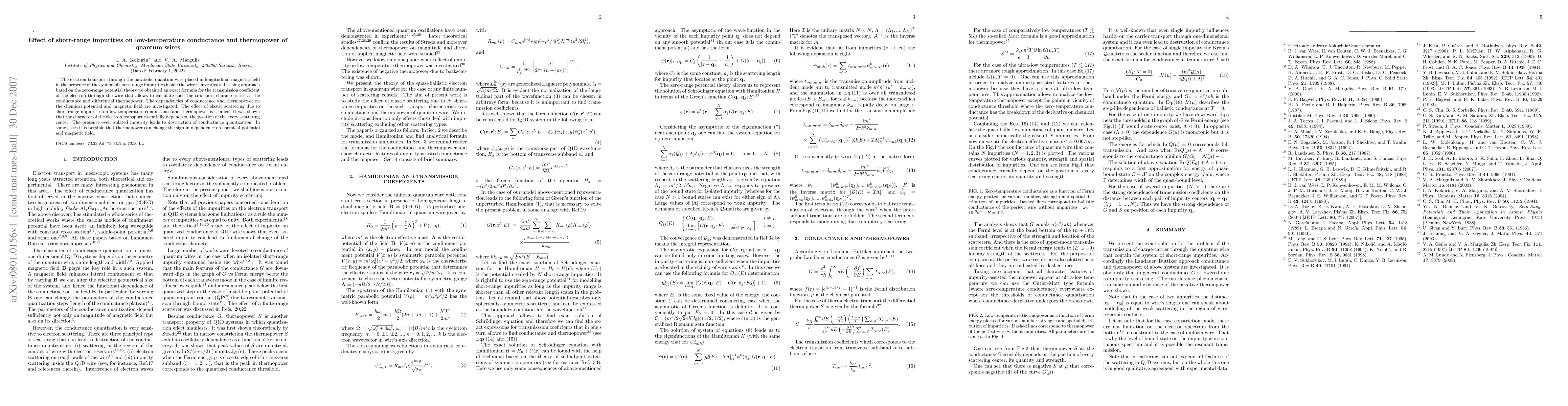 This paper investigates electron transport in a quantum wire under a magnetic field with short-range impurities, deriving an exact formula for the transmission coefficient. It finds that impurities disrupt conductance quantization and can cause thermopower to change sign depending on chemical potential and magnetic field.