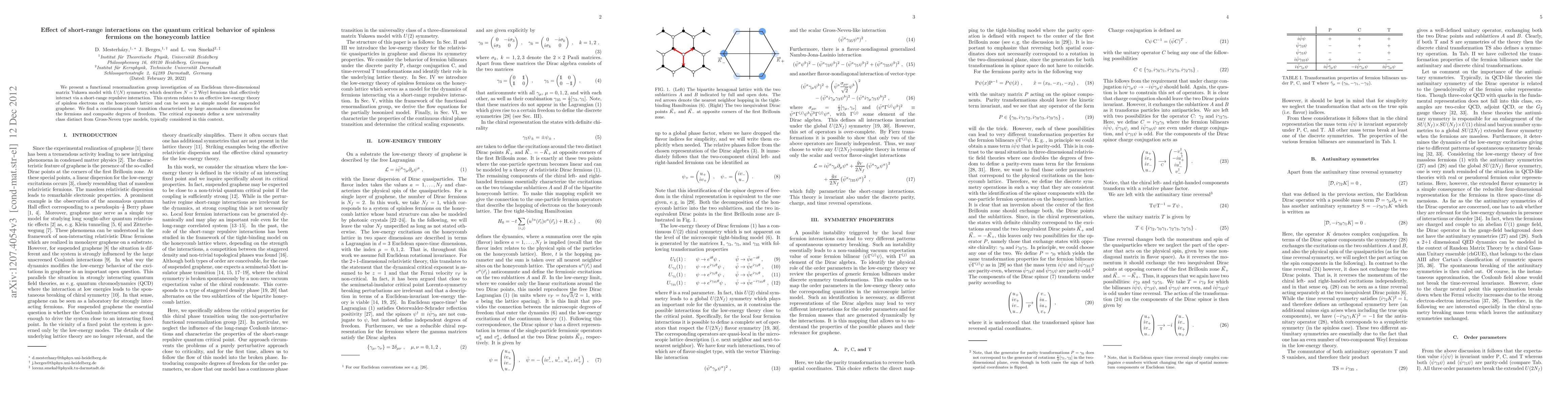 This study uses functional renormalization group methods to investigate the quantum critical behavior of spinless fermions on a honeycomb lattice, revealing a continuous phase transition with large anomalous dimensions and defining a new universality class distinct from conventional Gross-Neveu models.