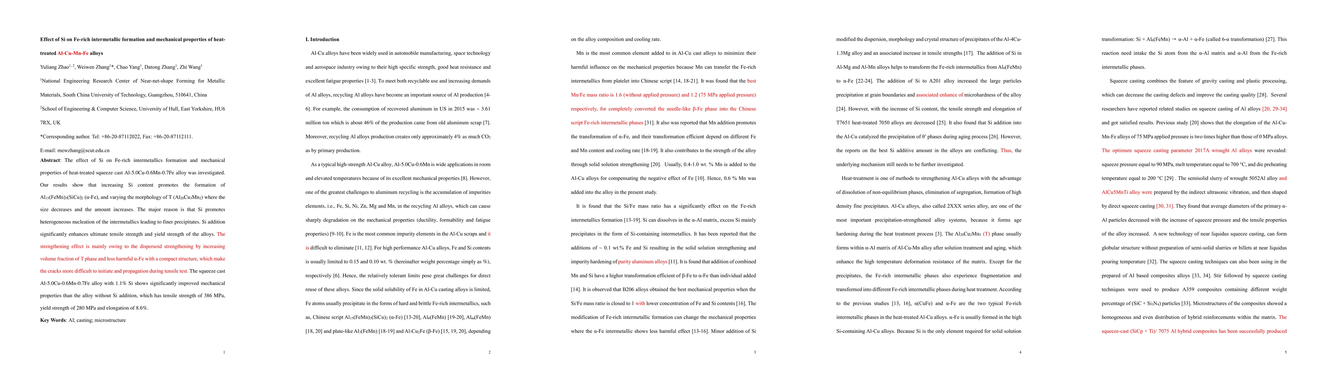 This study investigates how silicon influences the formation of Fe-rich intermetallics and mechanical properties in heat-treated Al-Cu-Mn-Fe alloys. Results show that increased Si content promotes the formation of Al15(FeMn)3(SiCu)2 and modifies the T phase, enhancing tensile and yield strength due to finer precipitates and a higher volume fraction of the T phase.